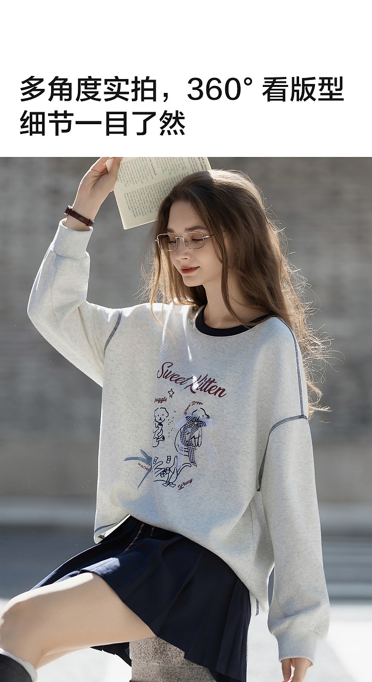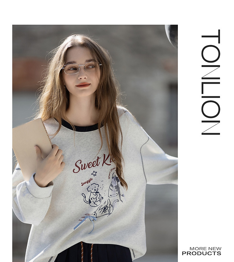 唐狮2026春秋冬季卫衣女圆领加绒加厚卡通印花宽松慵懒风设计时尚