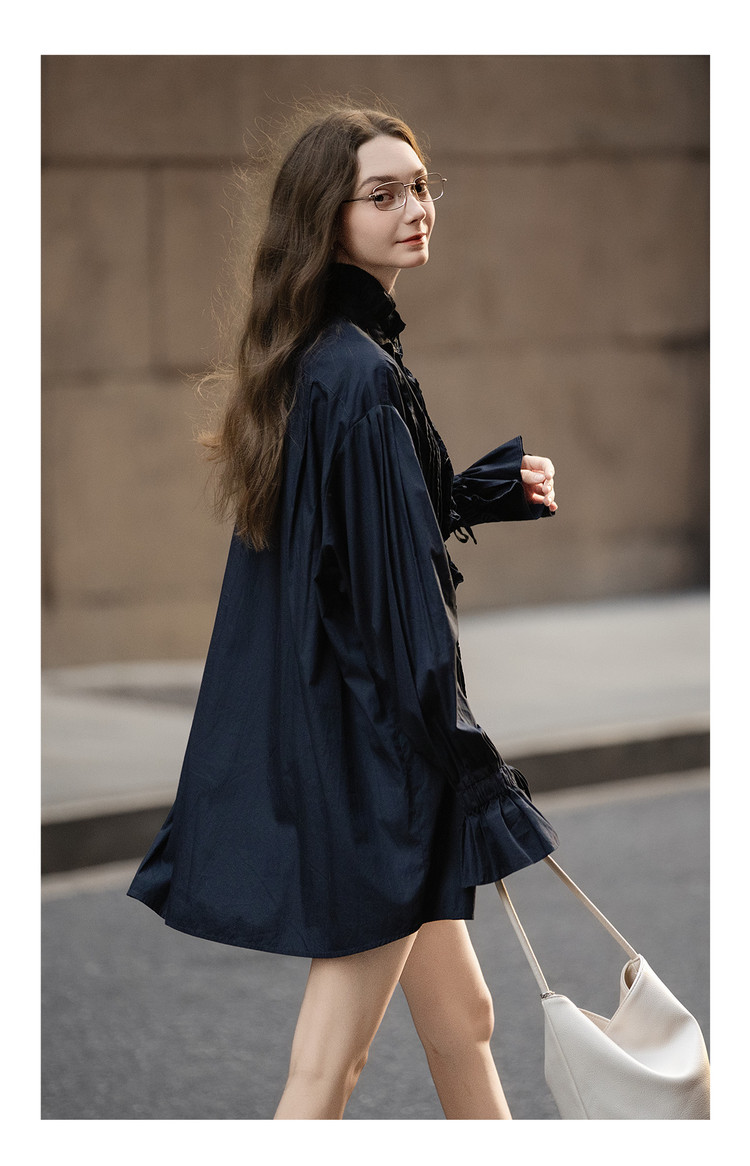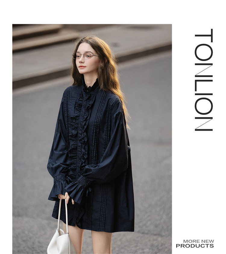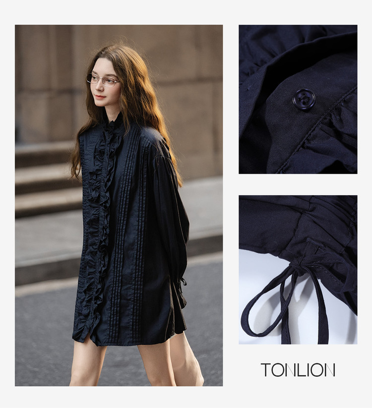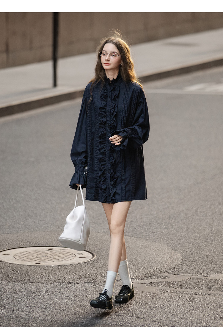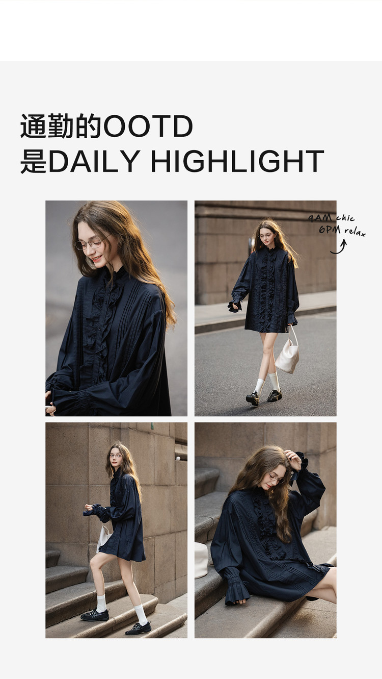 【关晓彤同款】唐狮2026秋冬舒适精致女木耳花边长袖短款连衣裙