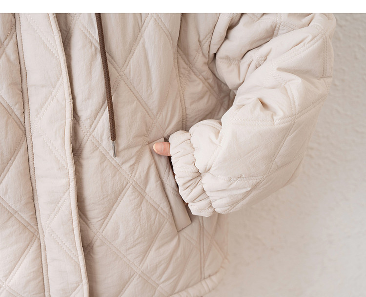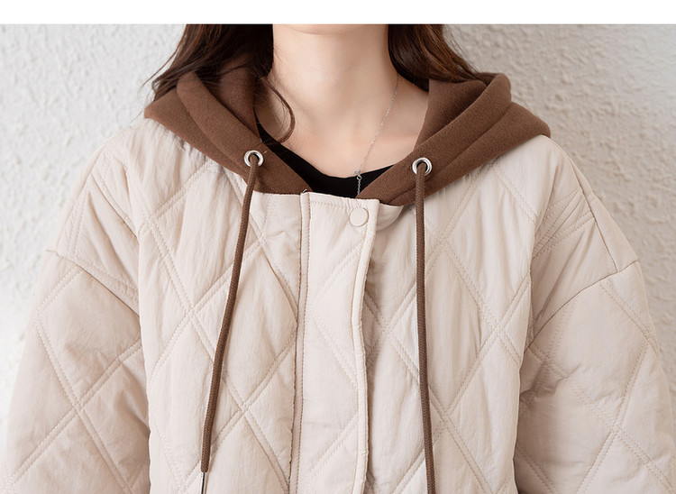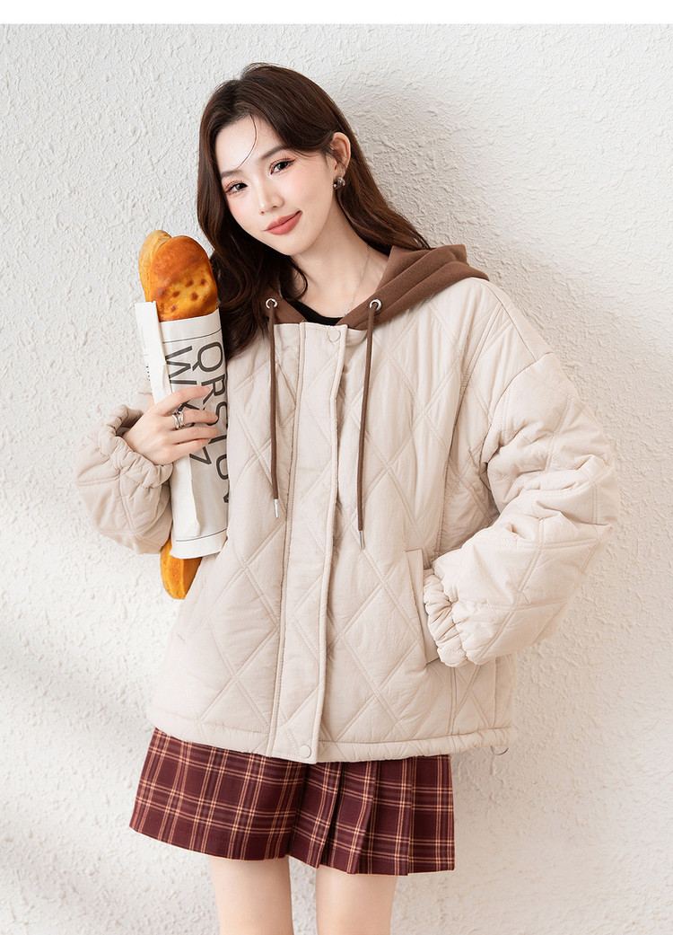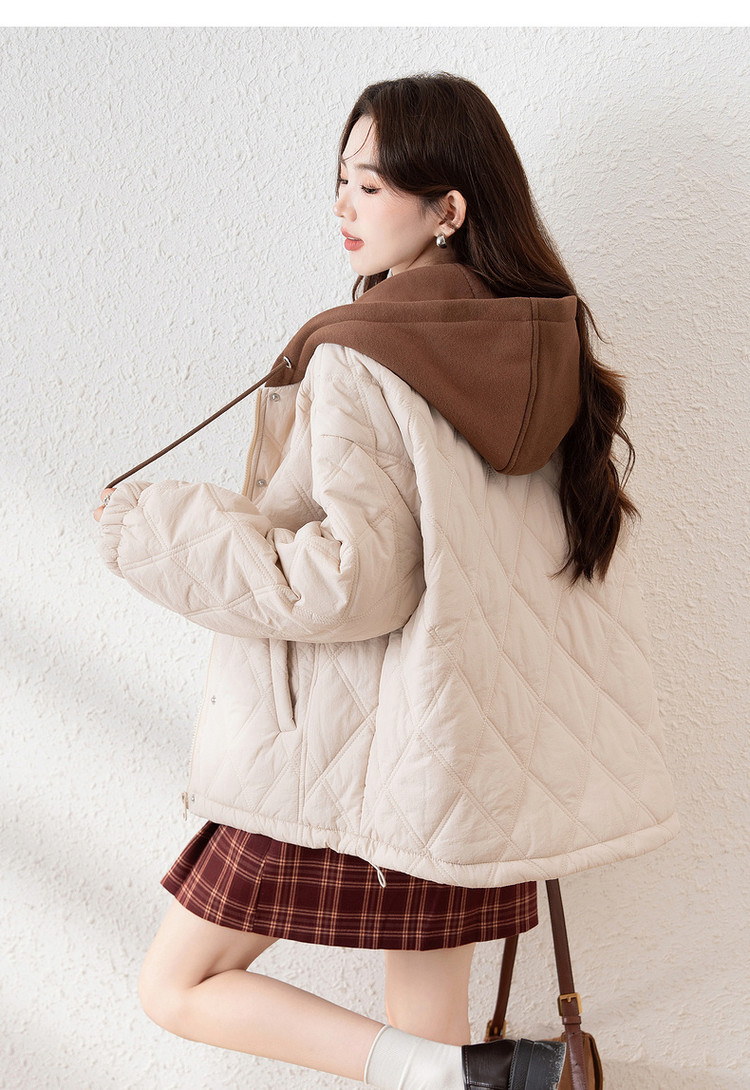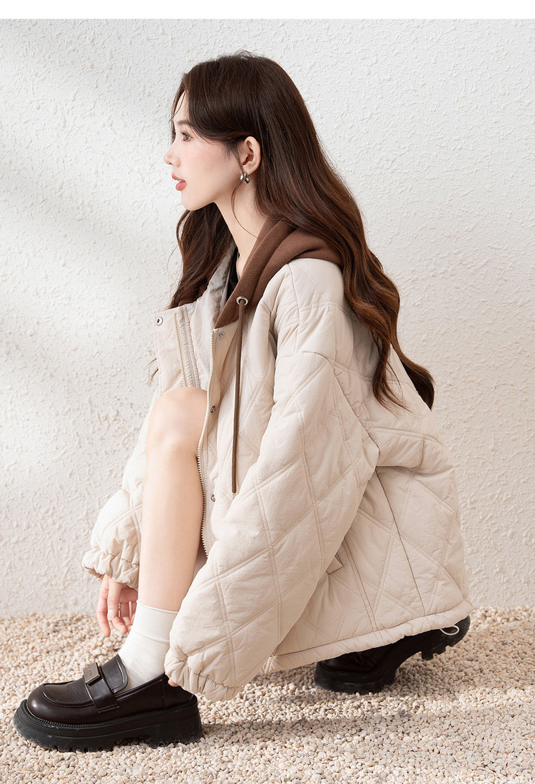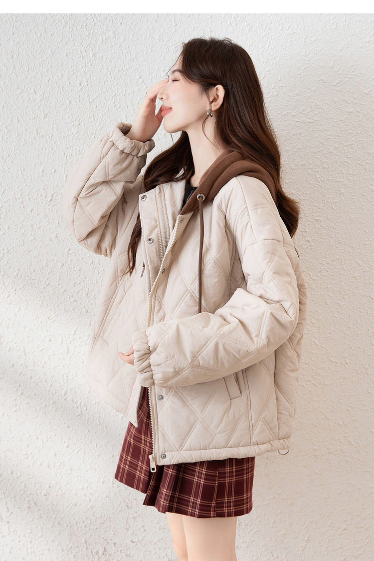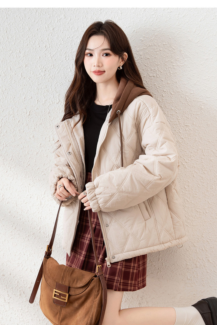 唐狮冬季新款连帽棉衣女外套夹棉假两件短款百搭菱形格棉袄