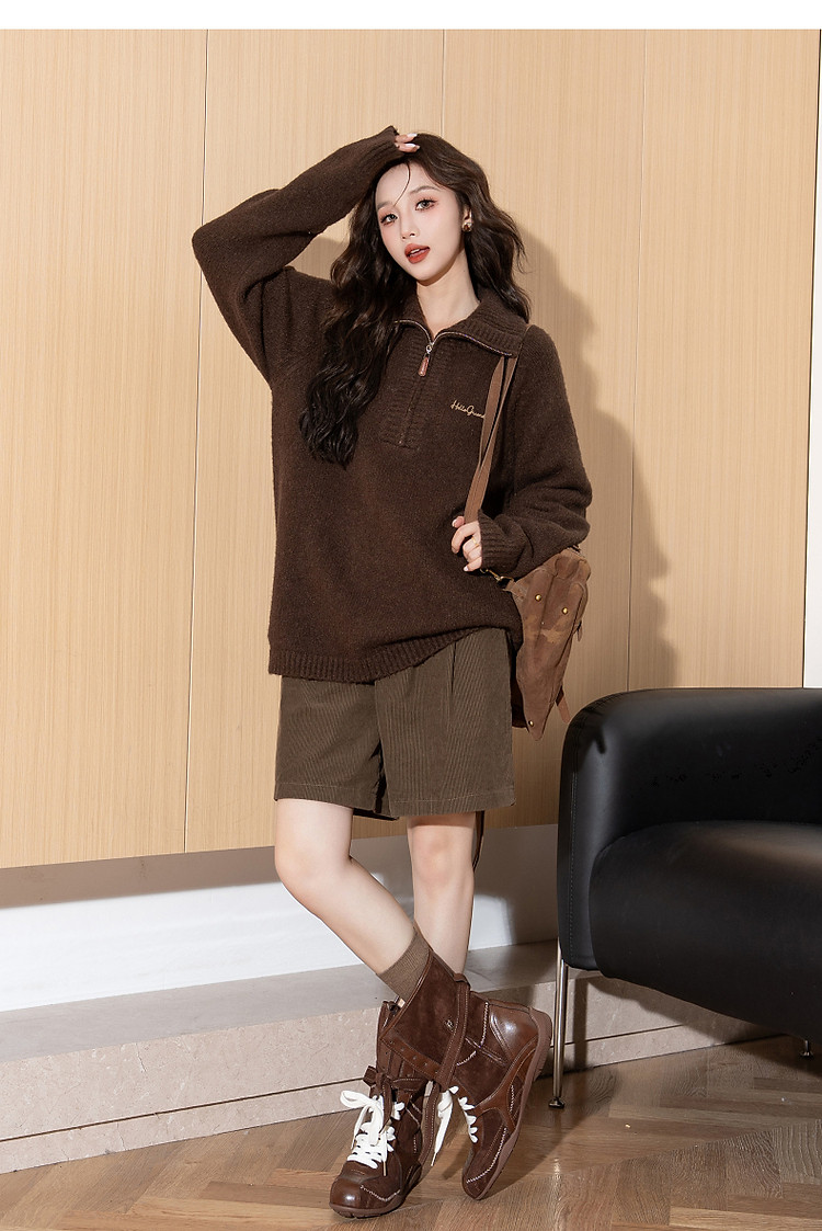 唐狮2026秋冬季女毛衣女翻领拉链半开襟净色小细节毛线衫美式复古