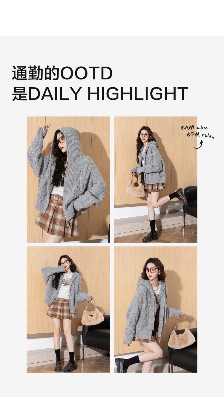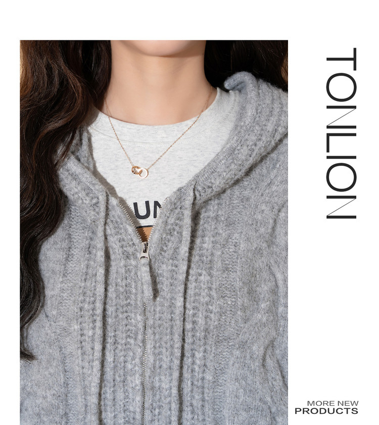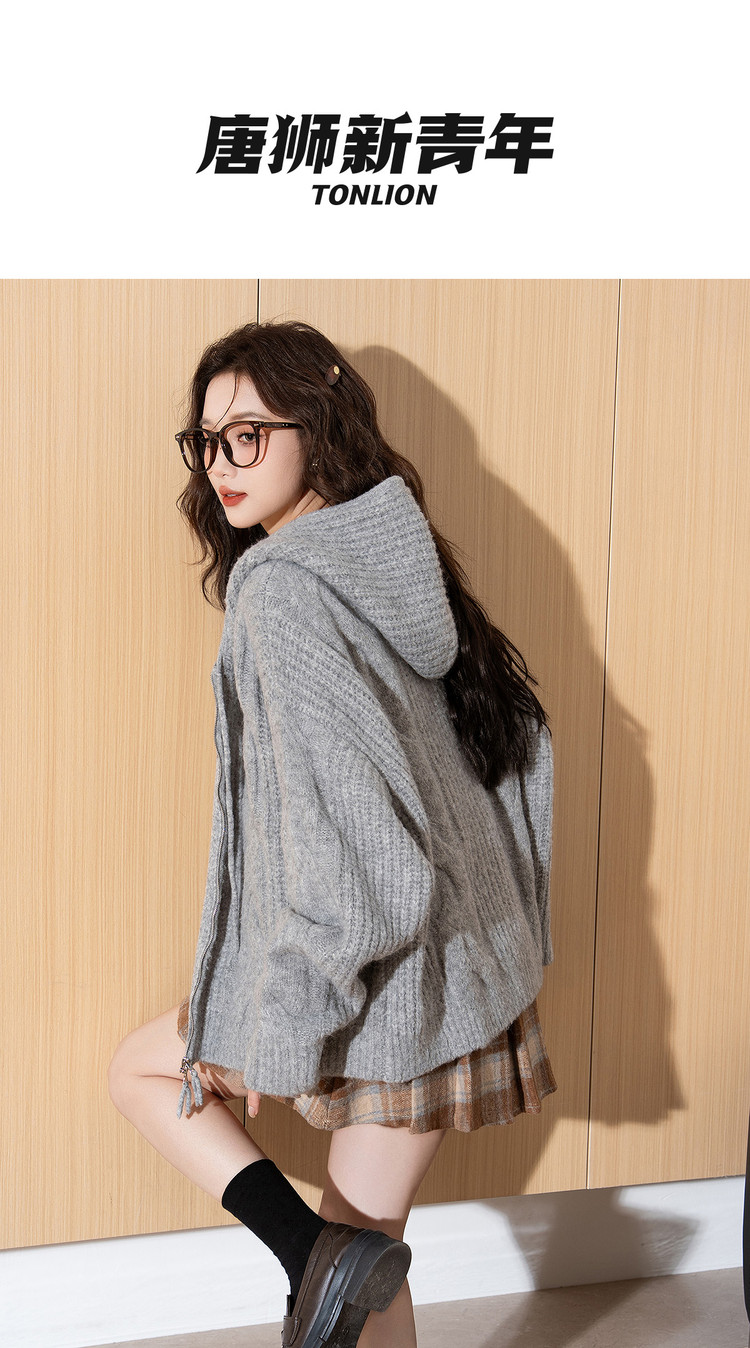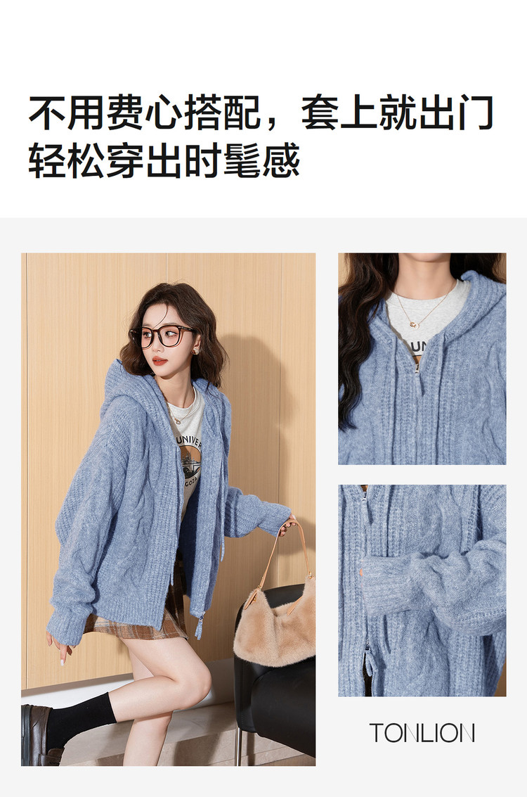 唐狮2026秋季毛衣开衫女连帽绞花双向拉链开衫毛线衫小个子慵懒风