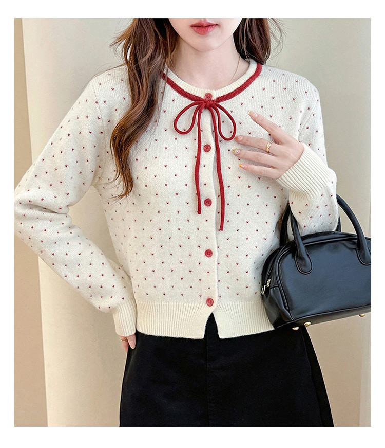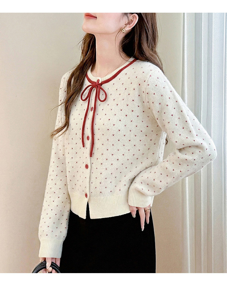 唐狮2026秋冬女圆领撞色钮扣满地提花开衫毛线衫百搭女毛衣韩系