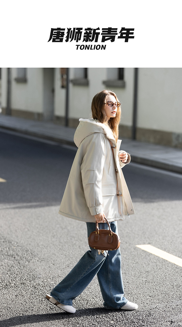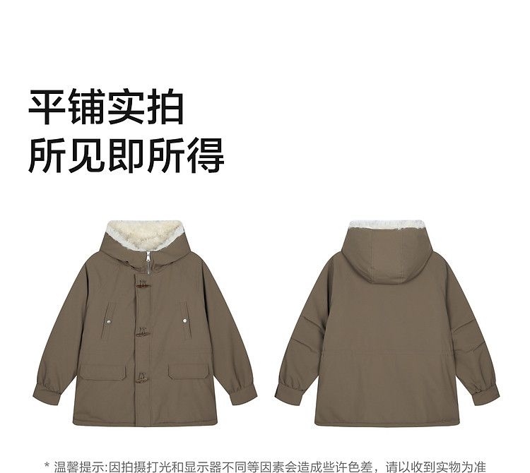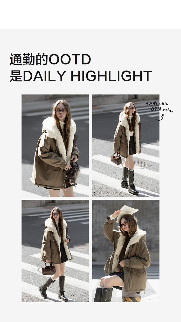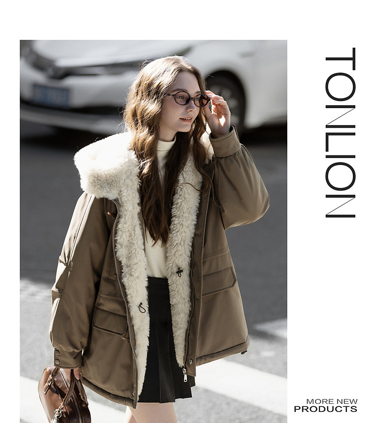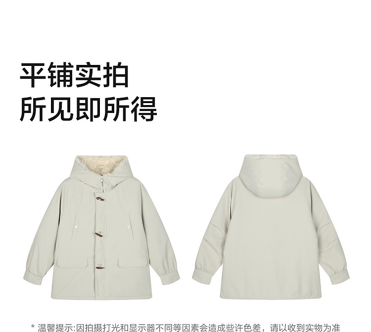 唐狮2026秋冬季短款棉衣女仿羊羔毛拼接连帽腰部抽绳收腰设计时尚
