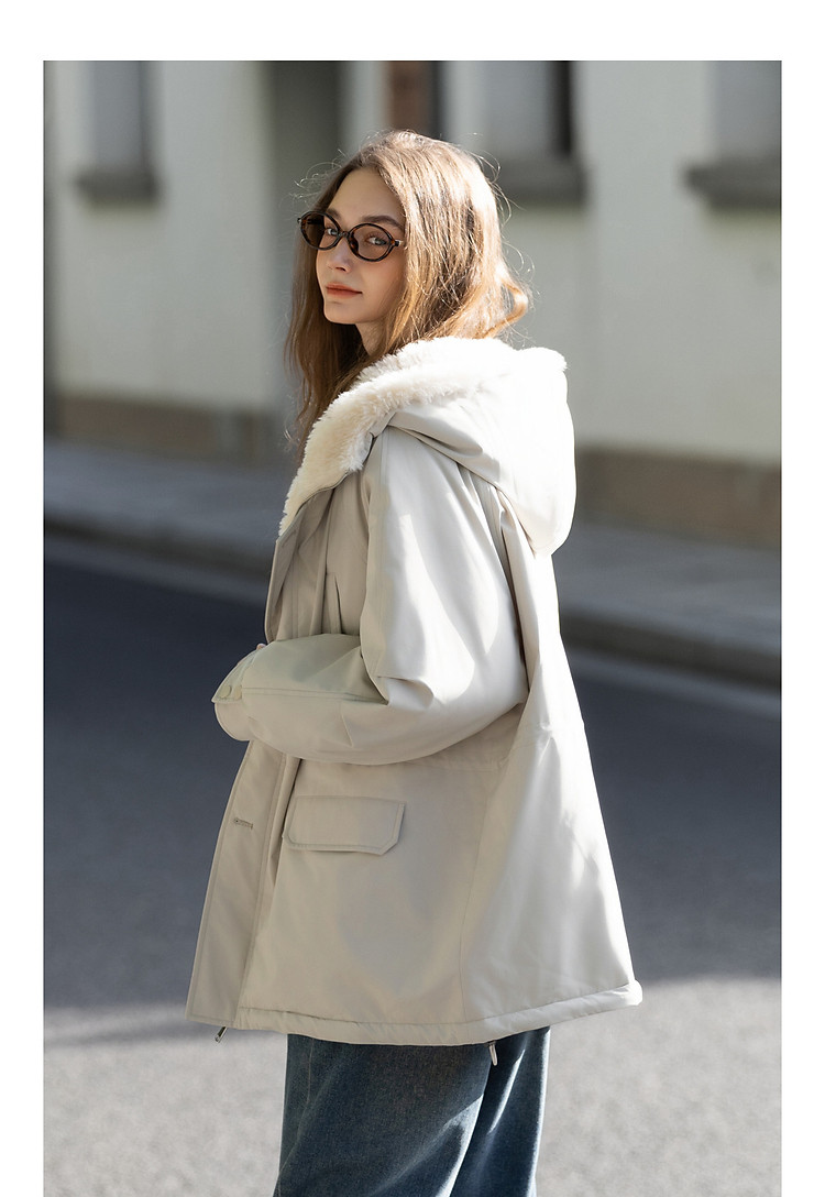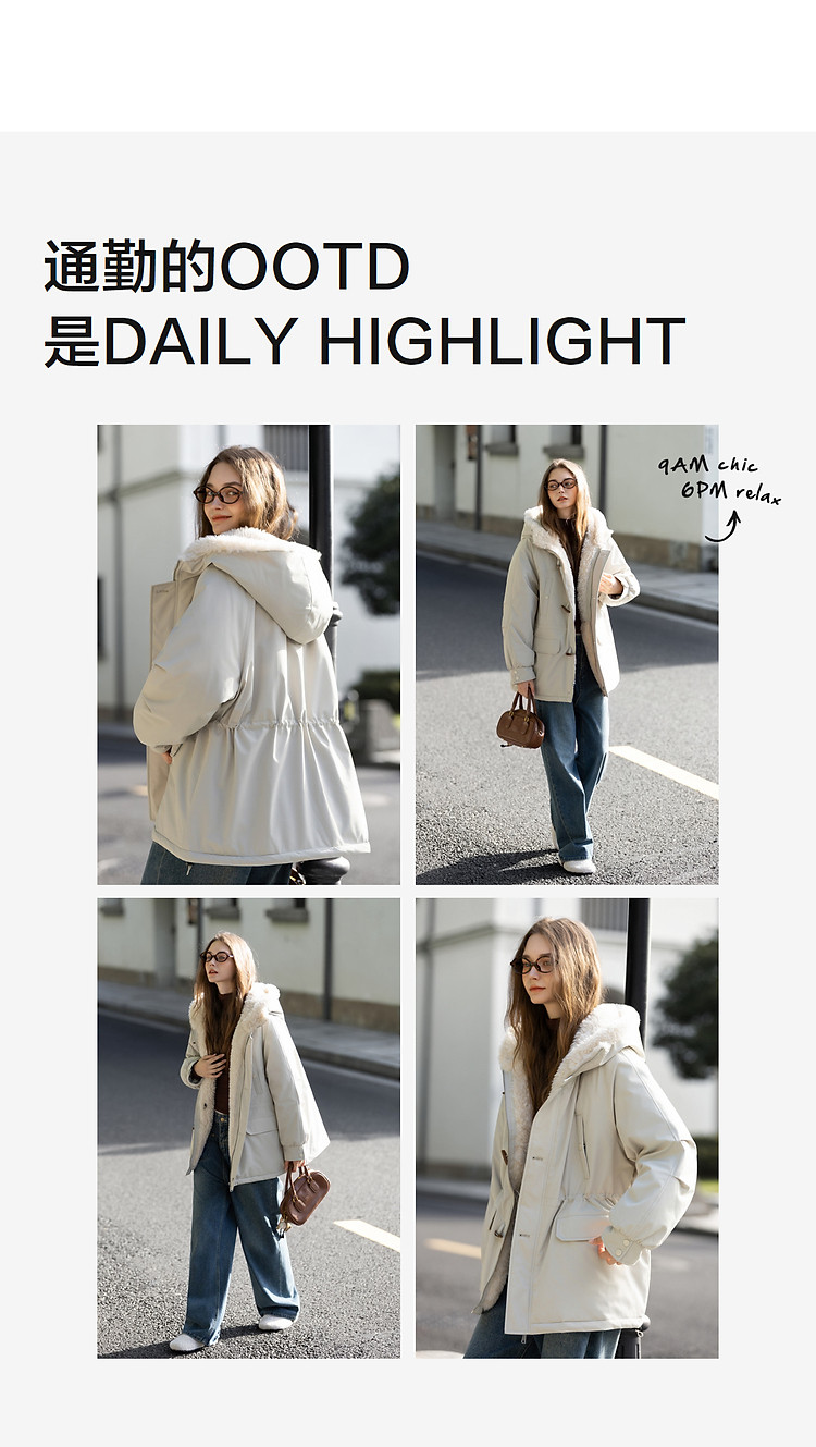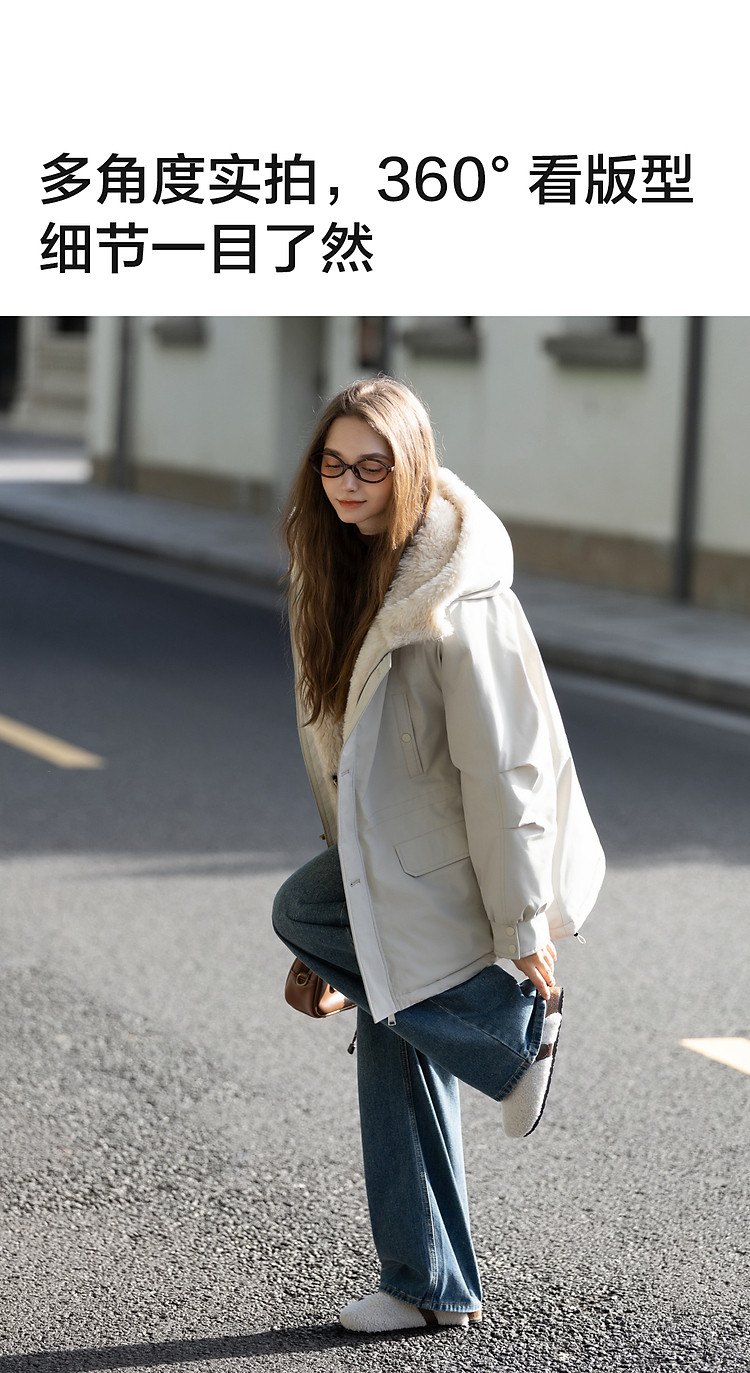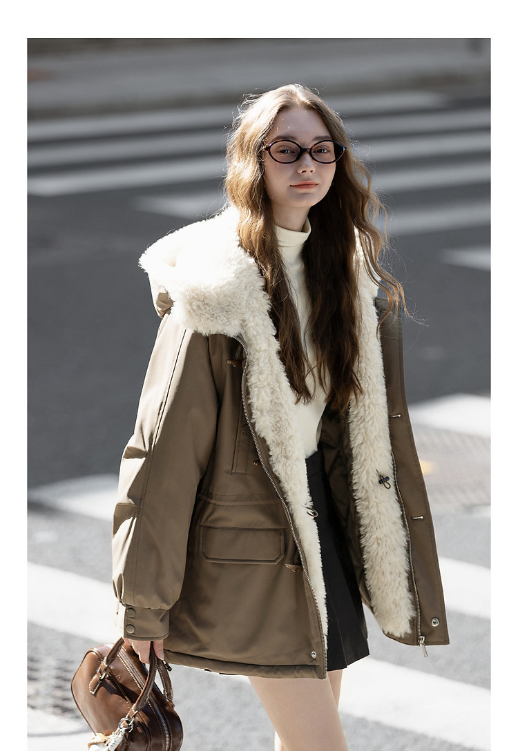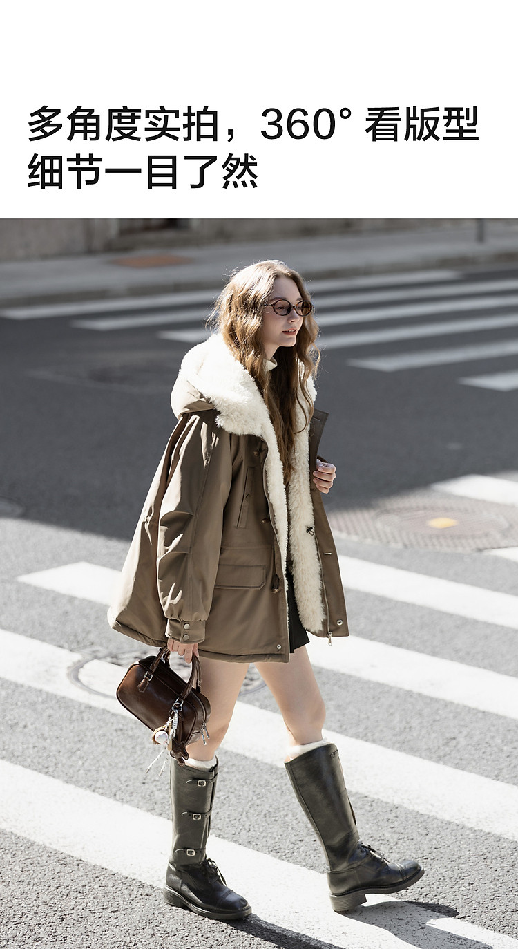 唐狮2026秋冬季短款棉衣女仿羊羔毛拼接连帽腰部抽绳收腰设计时尚
