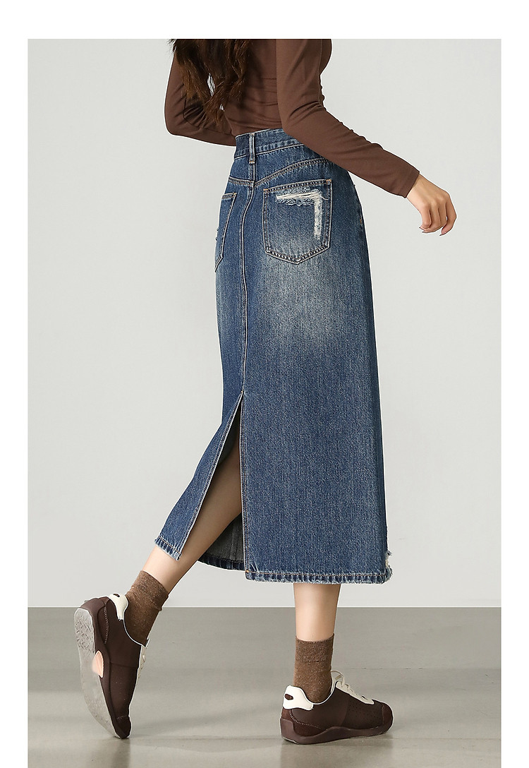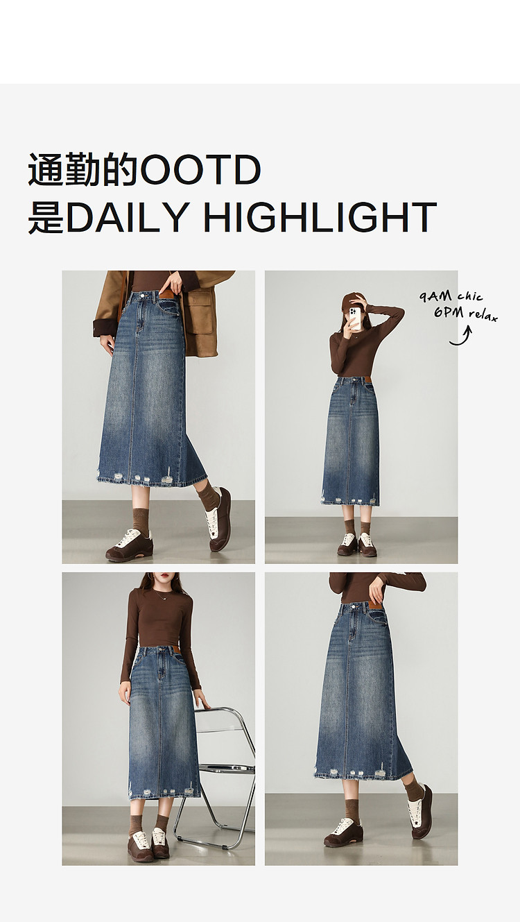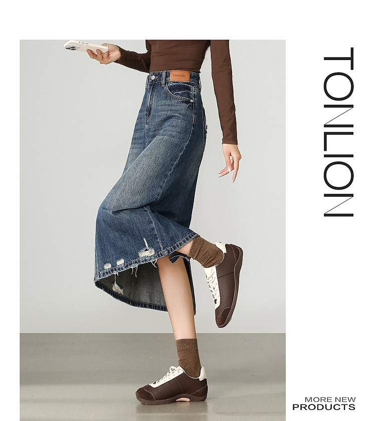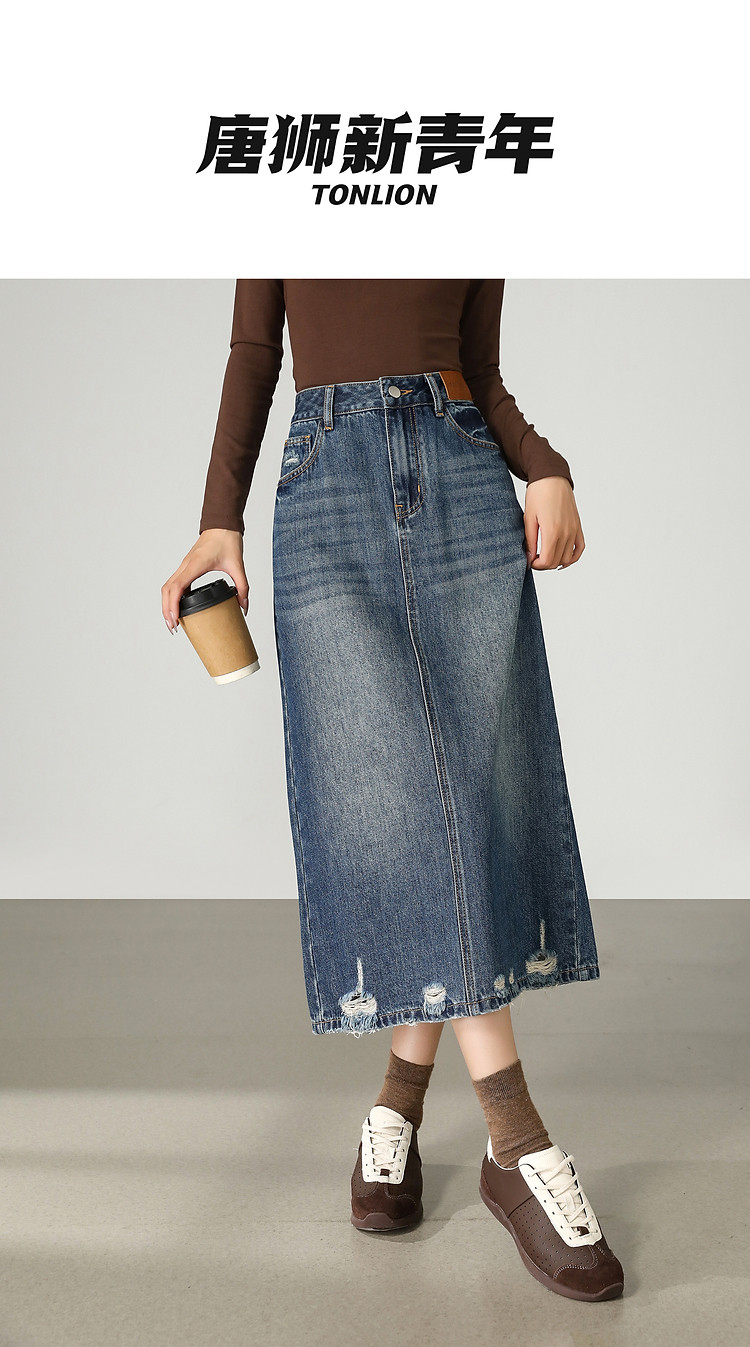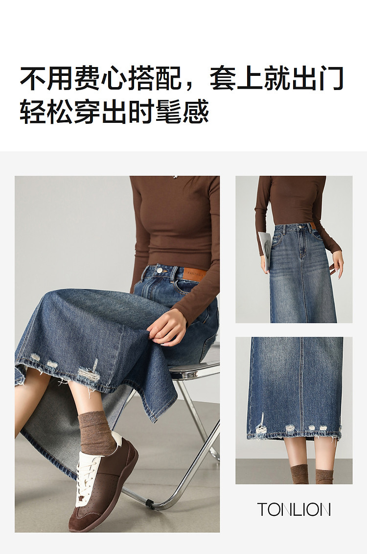唐狮25秋冬季新款牛仔半身长裙女高腰显瘦女休闲通勤牛仔破洞时尚