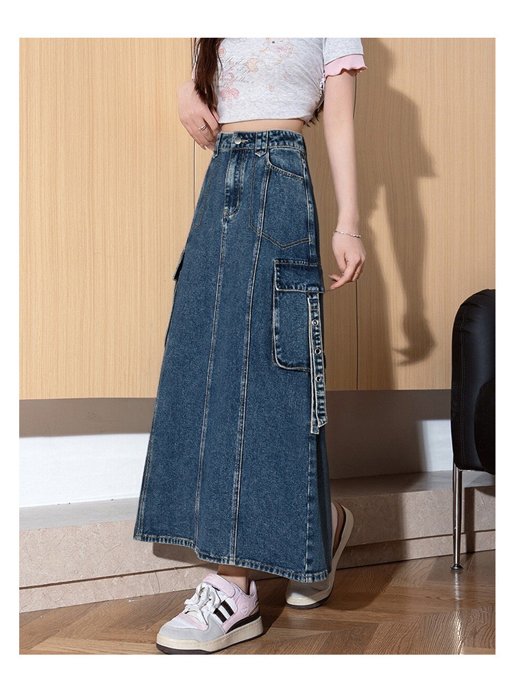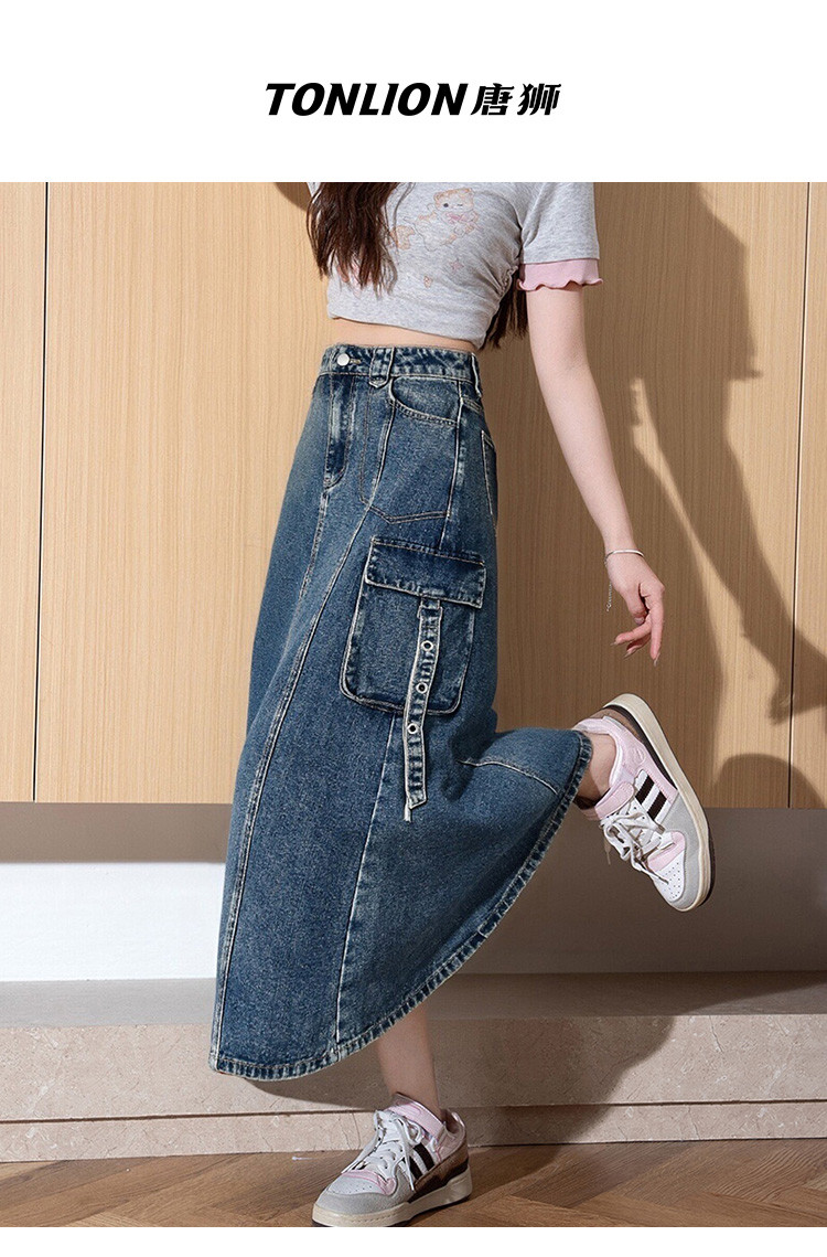 唐狮25秋冬季新款牛仔半身长裙女工装风飘带设计大口袋高腰显瘦X1