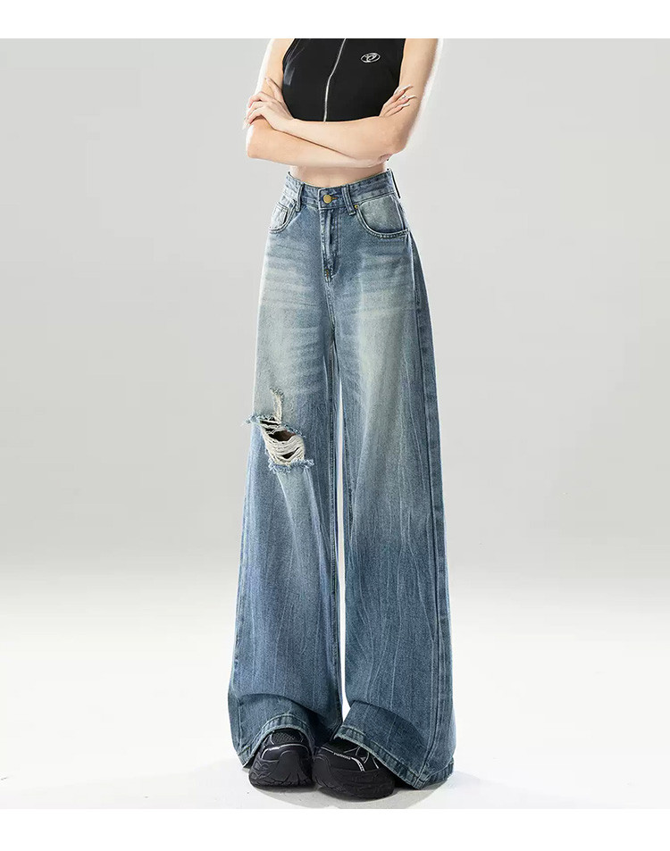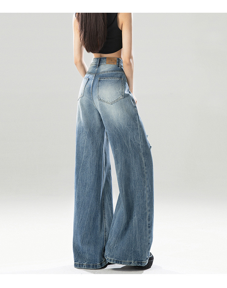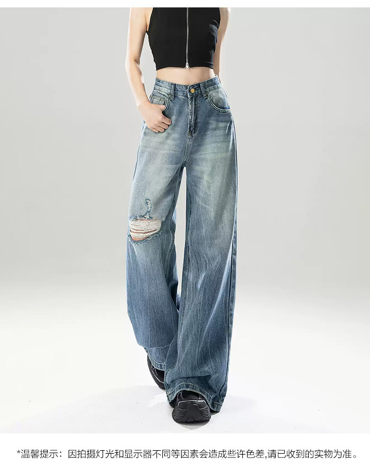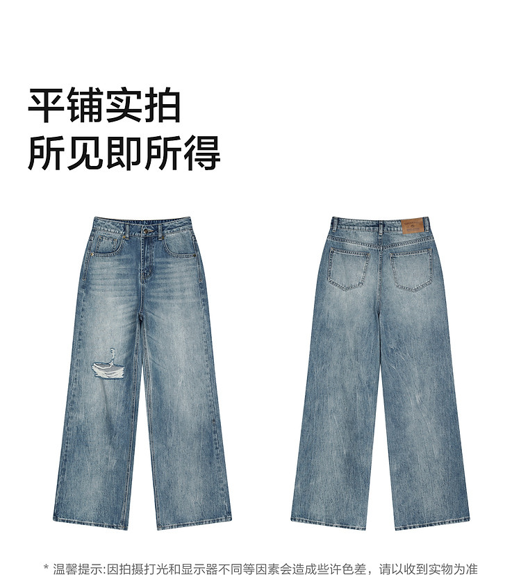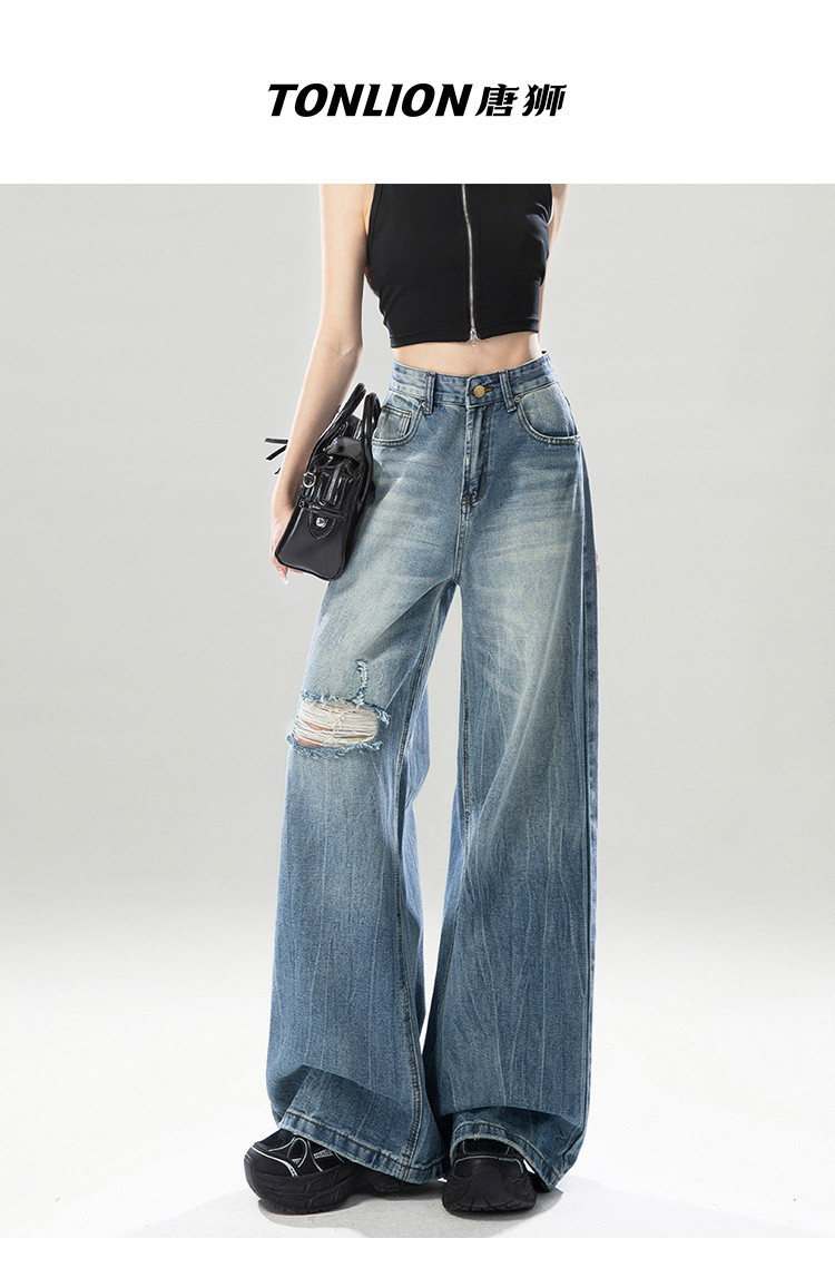 唐狮2026秋季新款女牛仔长裤宽松阔腿破洞复古水洗时尚潮流裤子K1