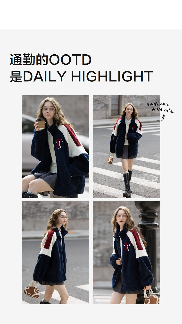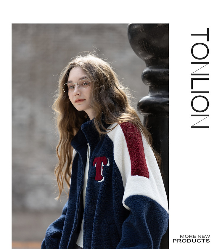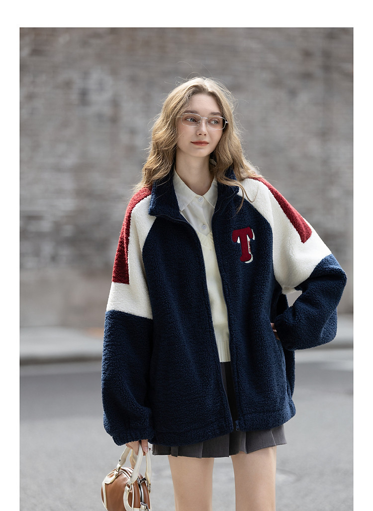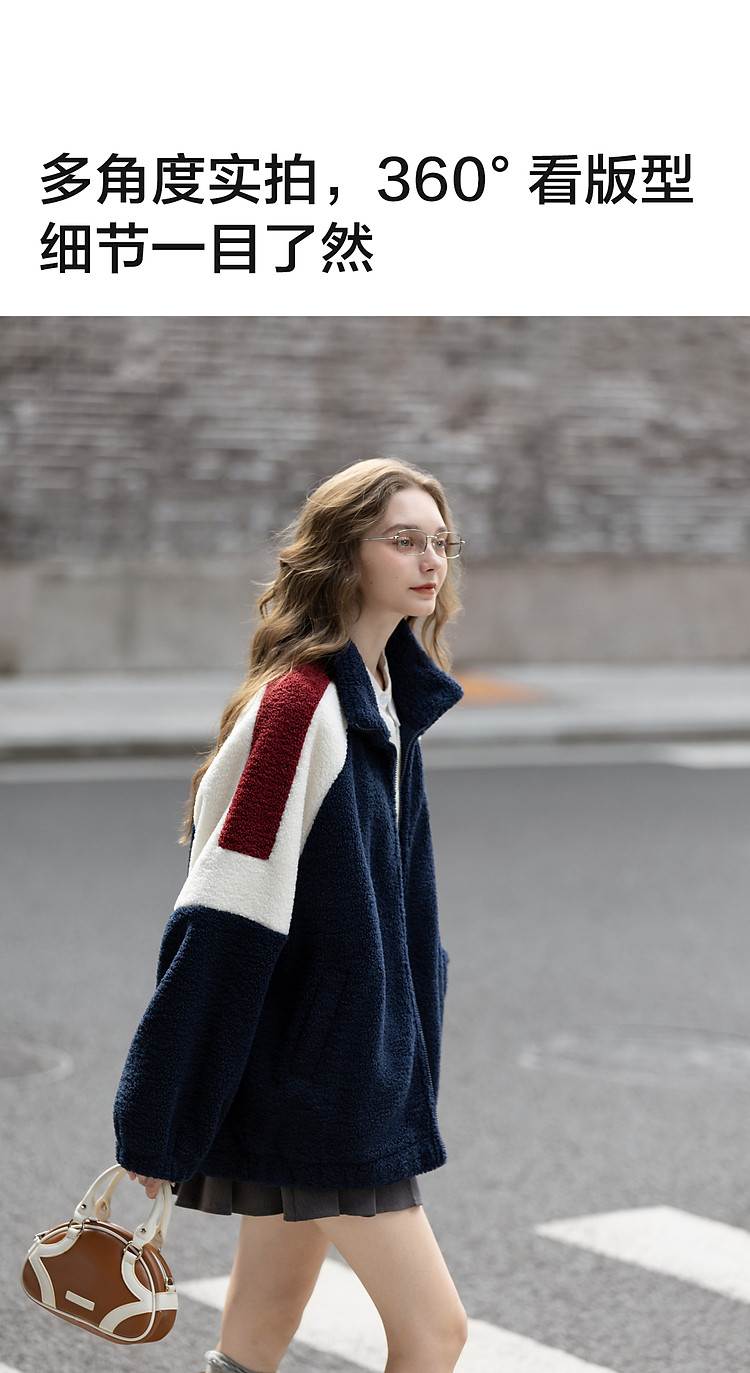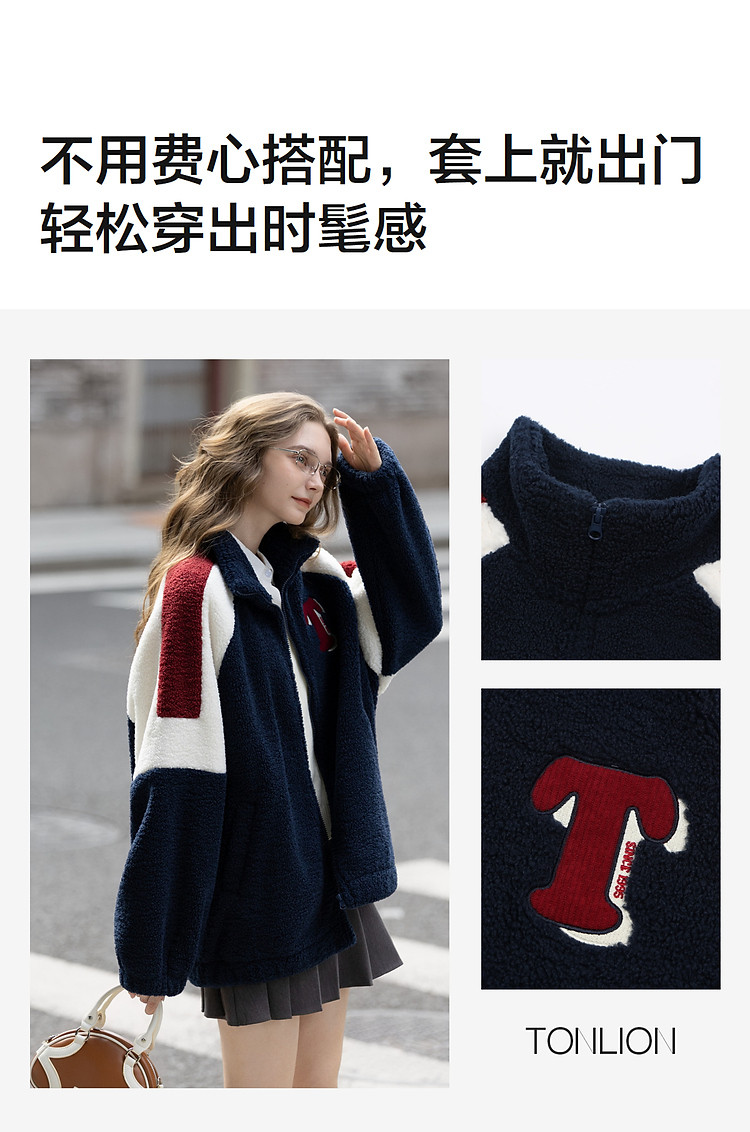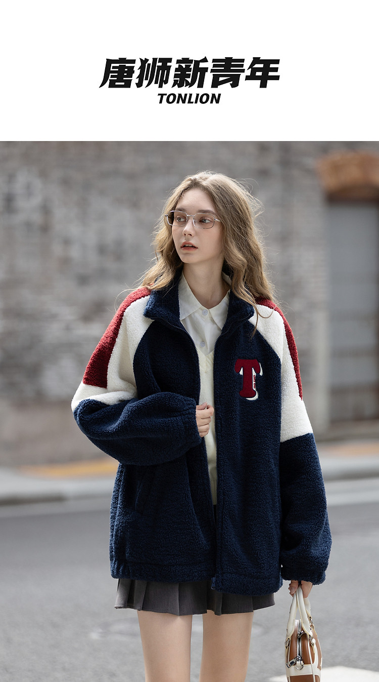 唐狮2026秋冬季仿羊羔毛外套女士休闲时尚女立领撞色拼接短款外套