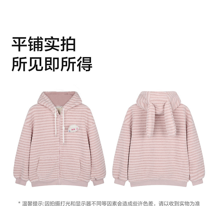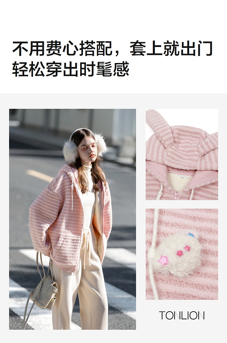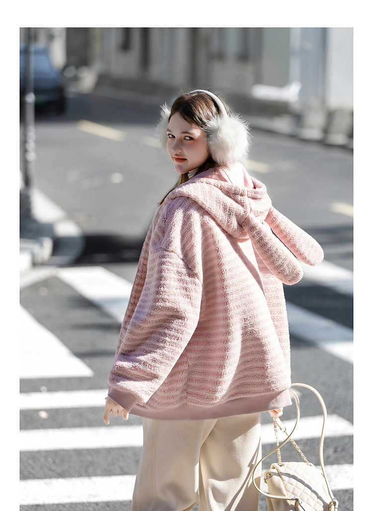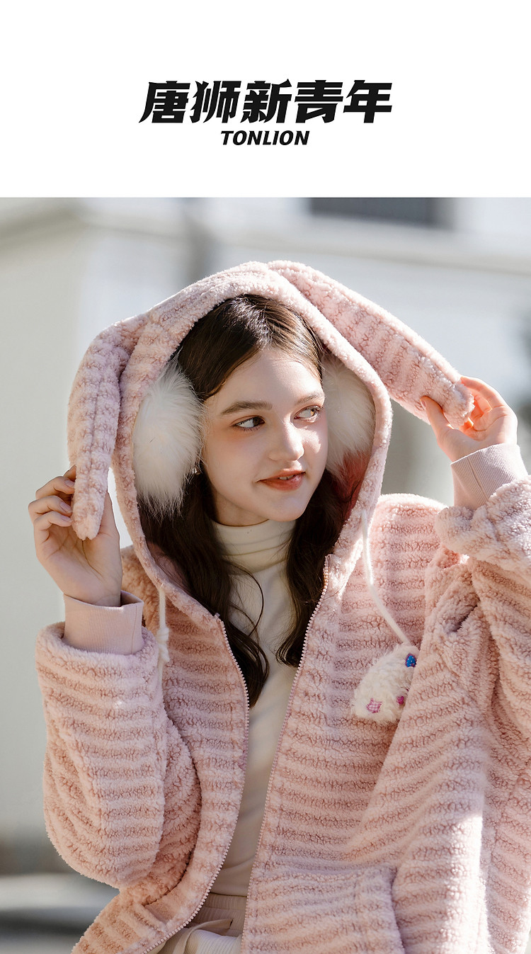 唐狮2026秋冬女条纹兔耳朵毛绒一手长外套可爱甜美少女风软糯