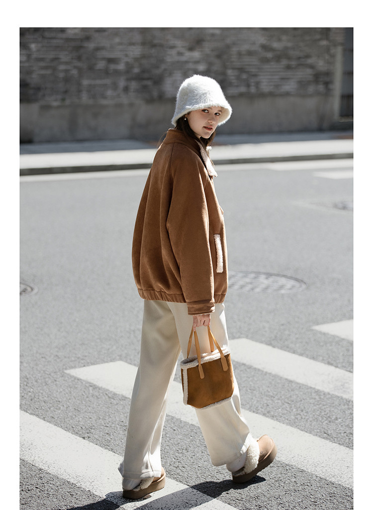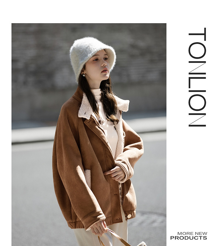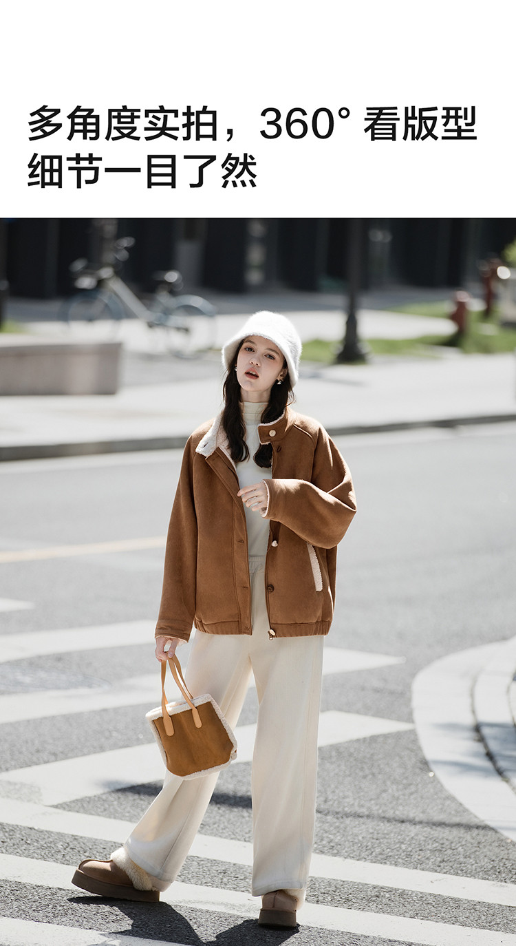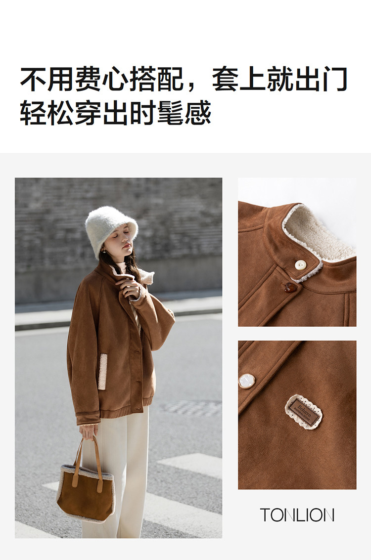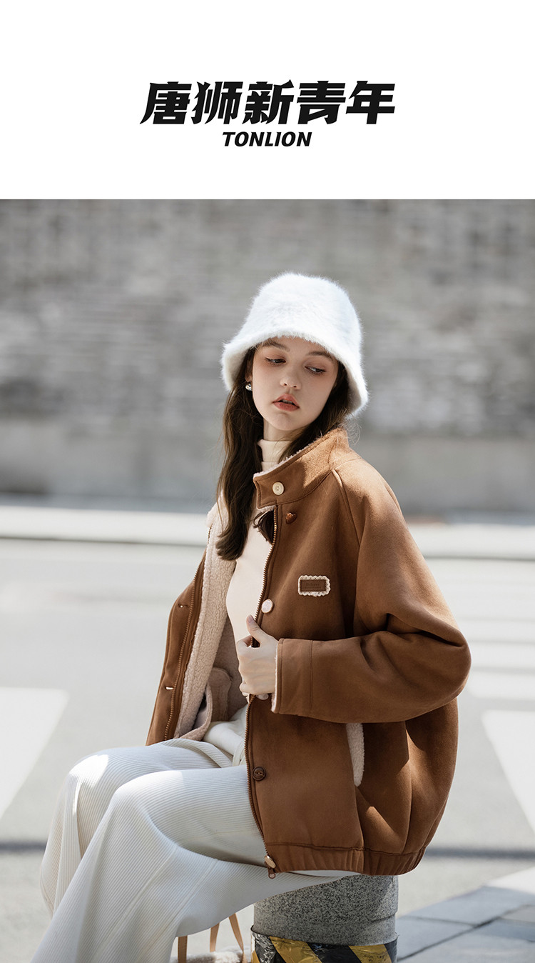 唐狮2026秋冬外套氛围感气质高级女立领左胸细节仿麂皮复合外套