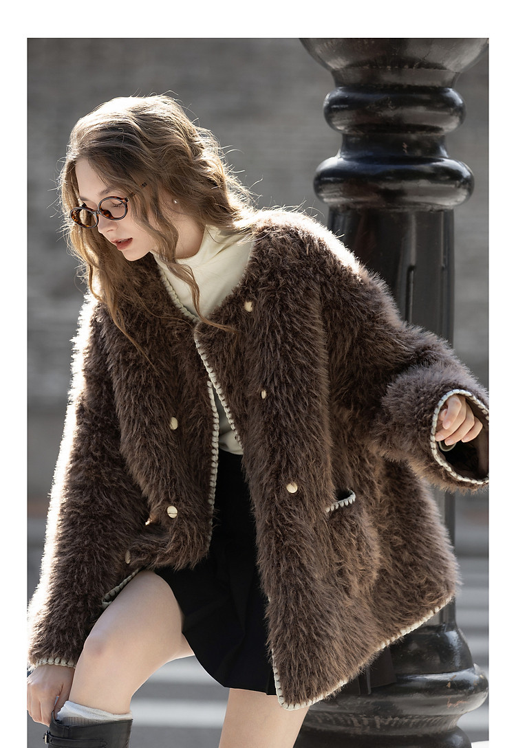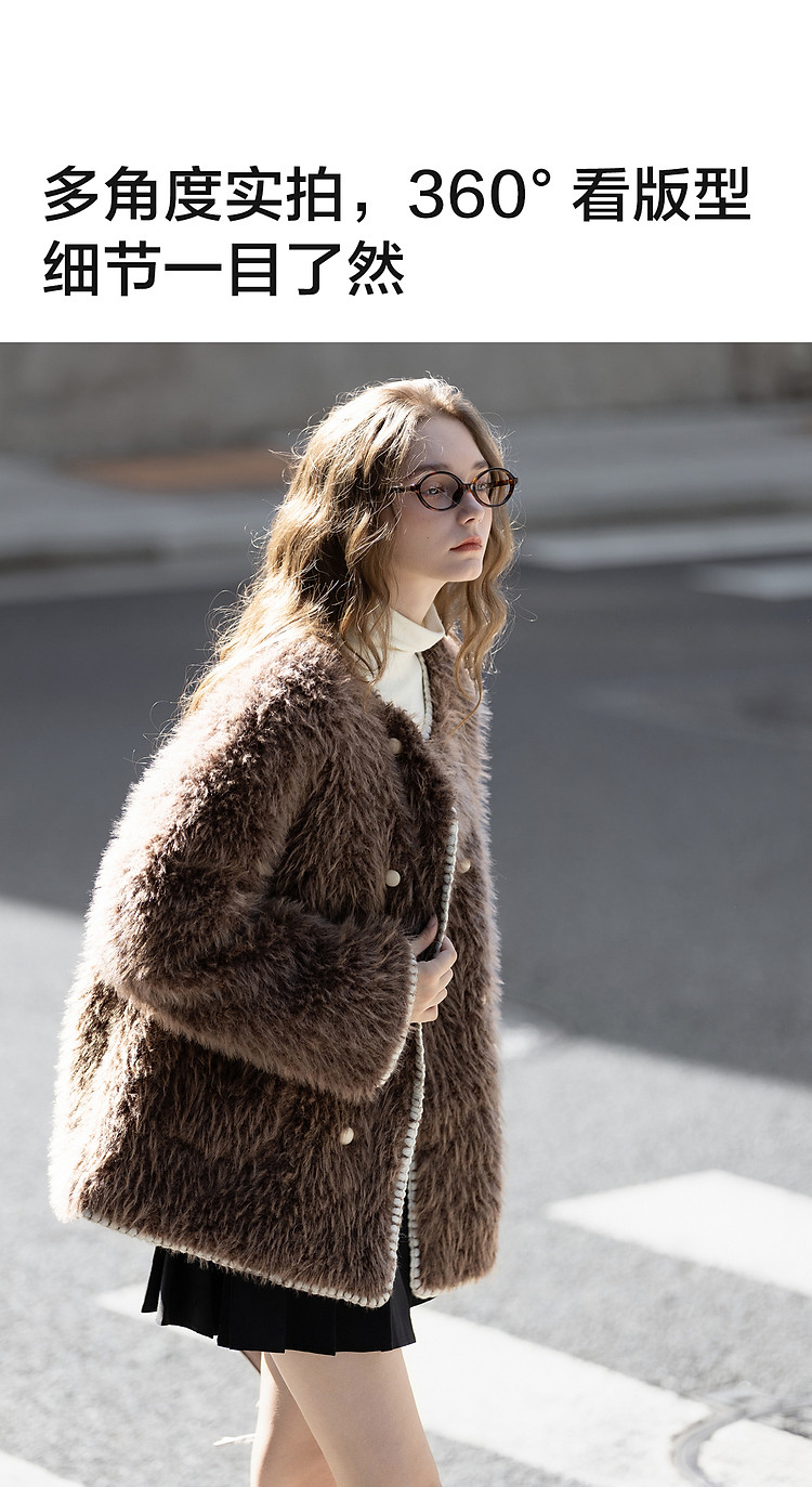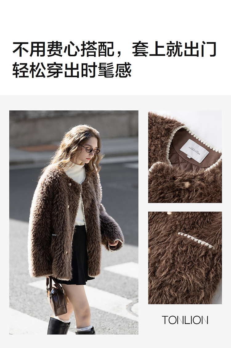 唐狮2026秋冬季短款厚外套女圆领撞色贝壳绣小香风毛茸茸保暖好看