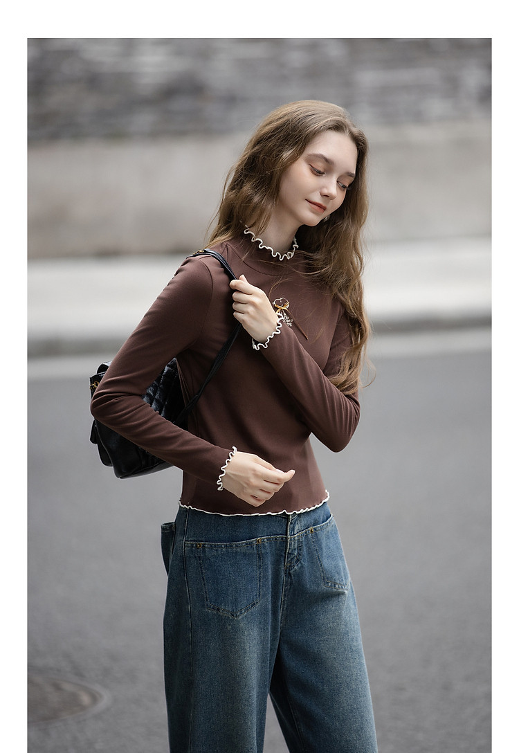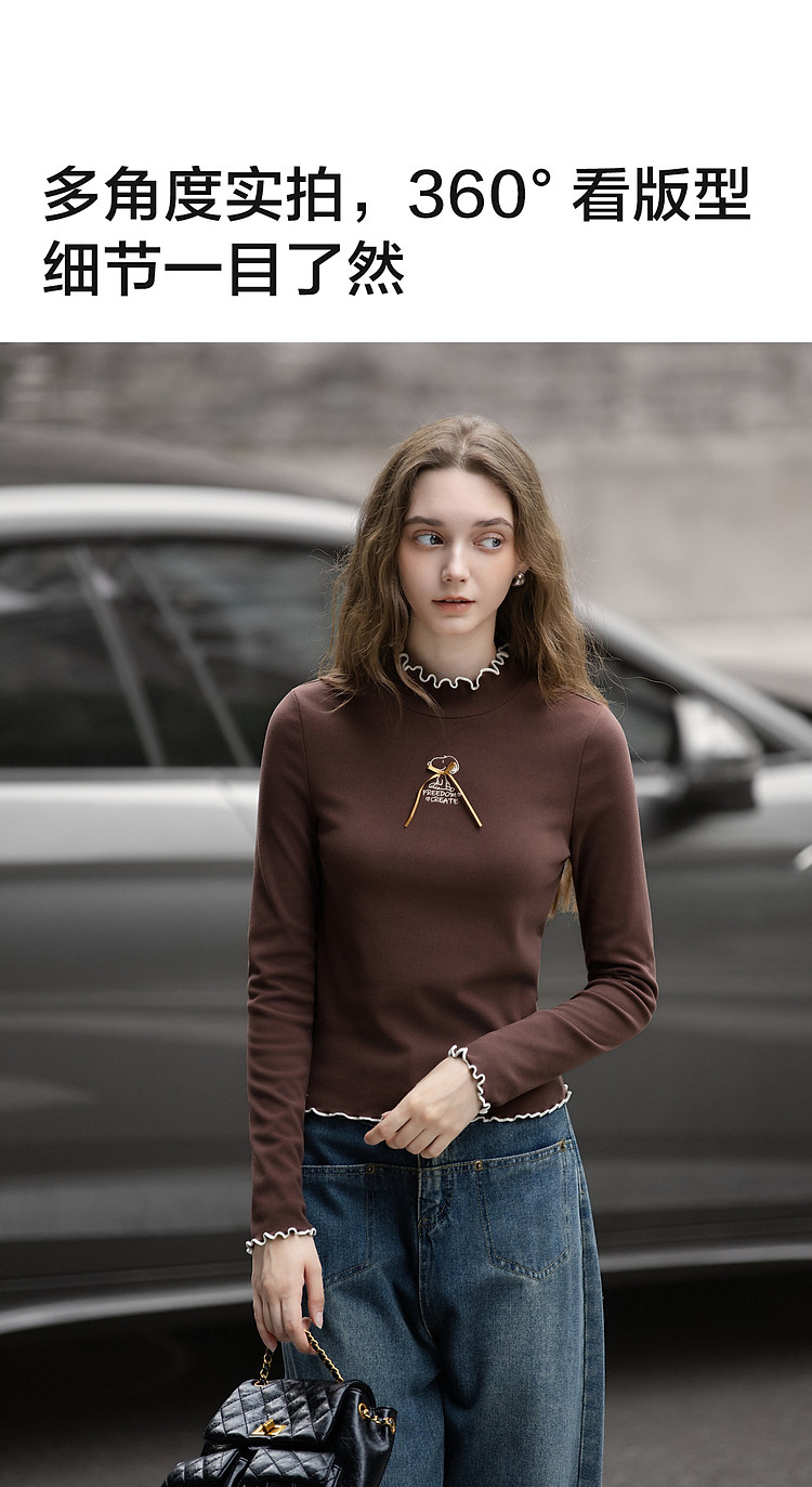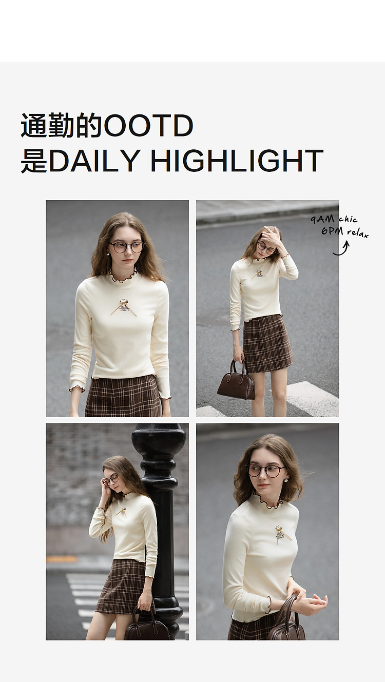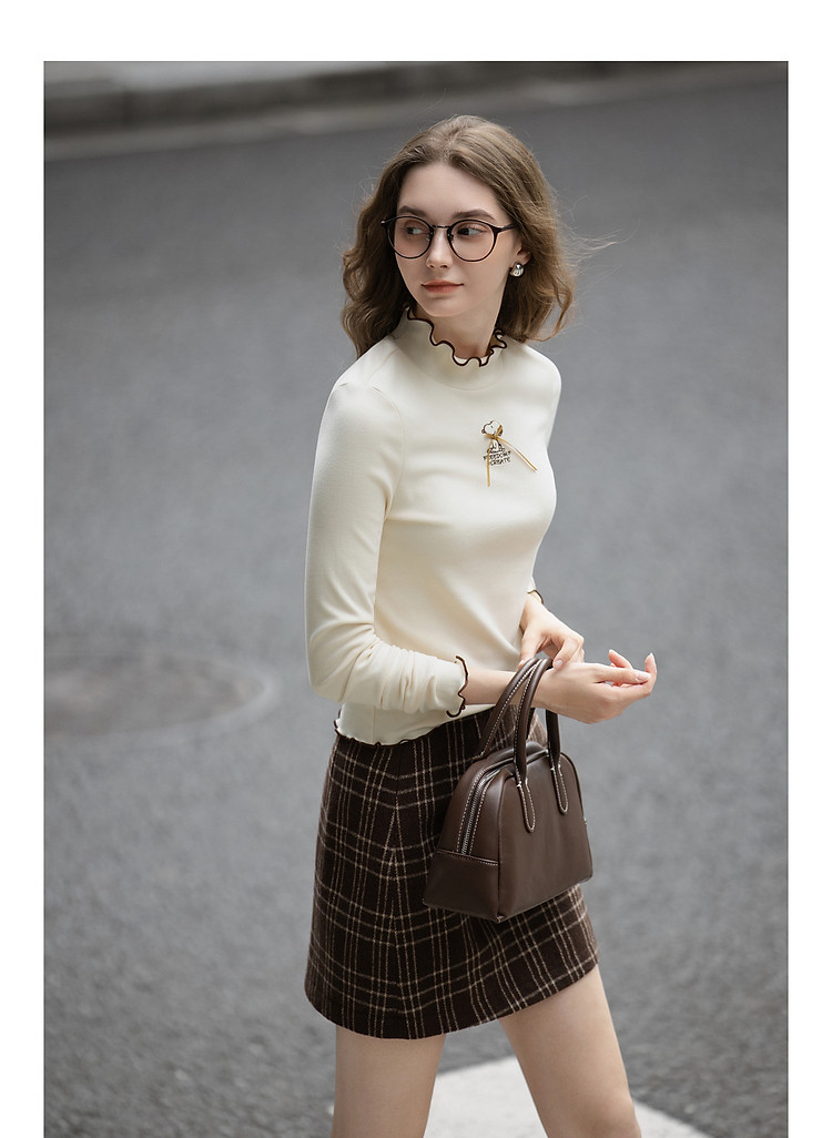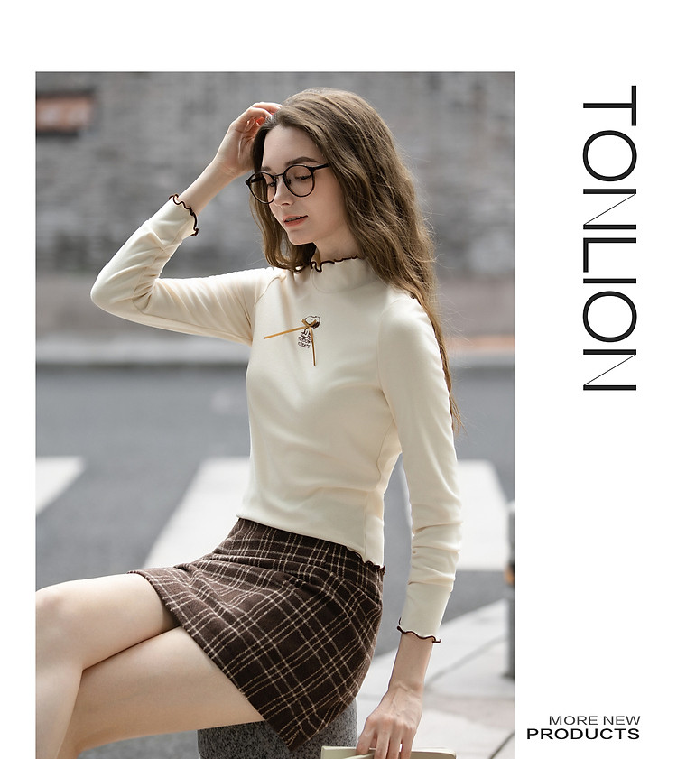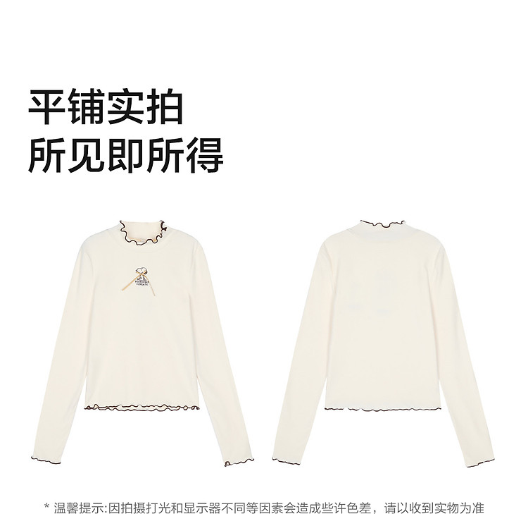 【史努比联名款】唐狮2026女半高领打底衣弹力间色木耳边打底衫