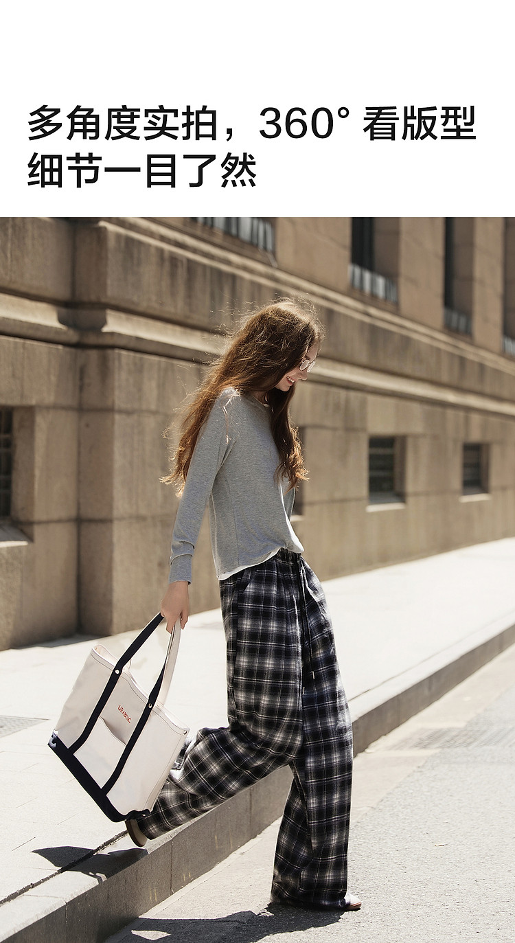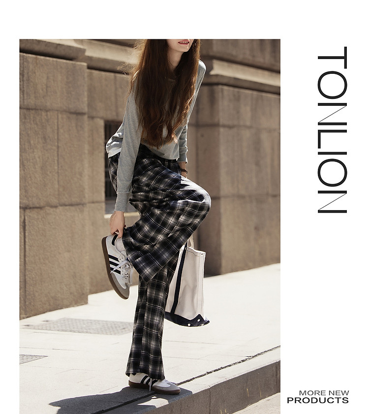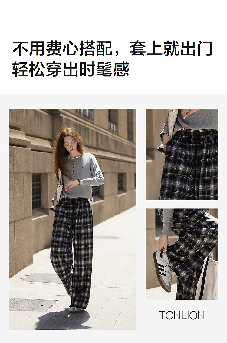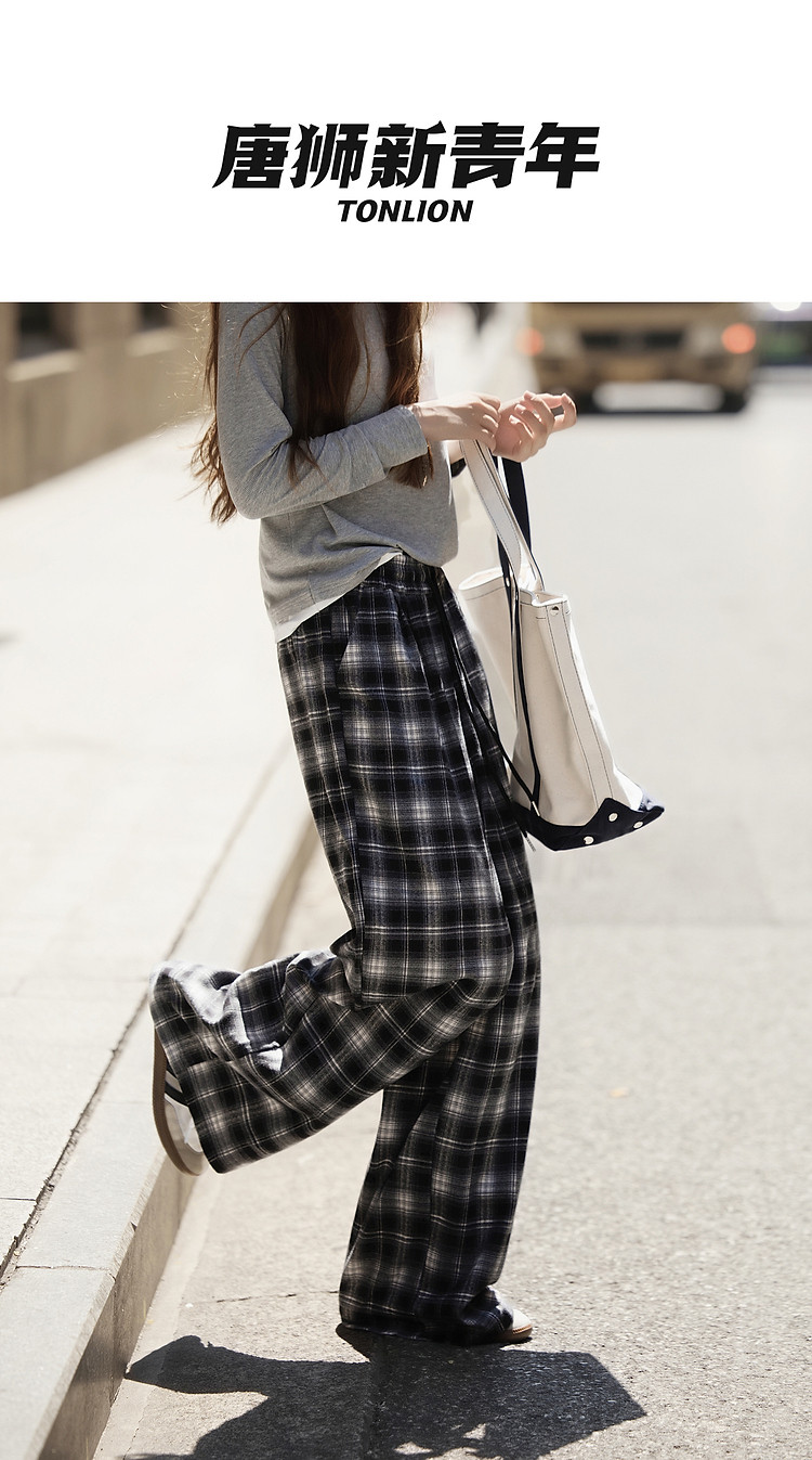 唐狮格子裤女2026秋季新款阔腿裤女高腰松弛感休闲垂感拖地裤子J1