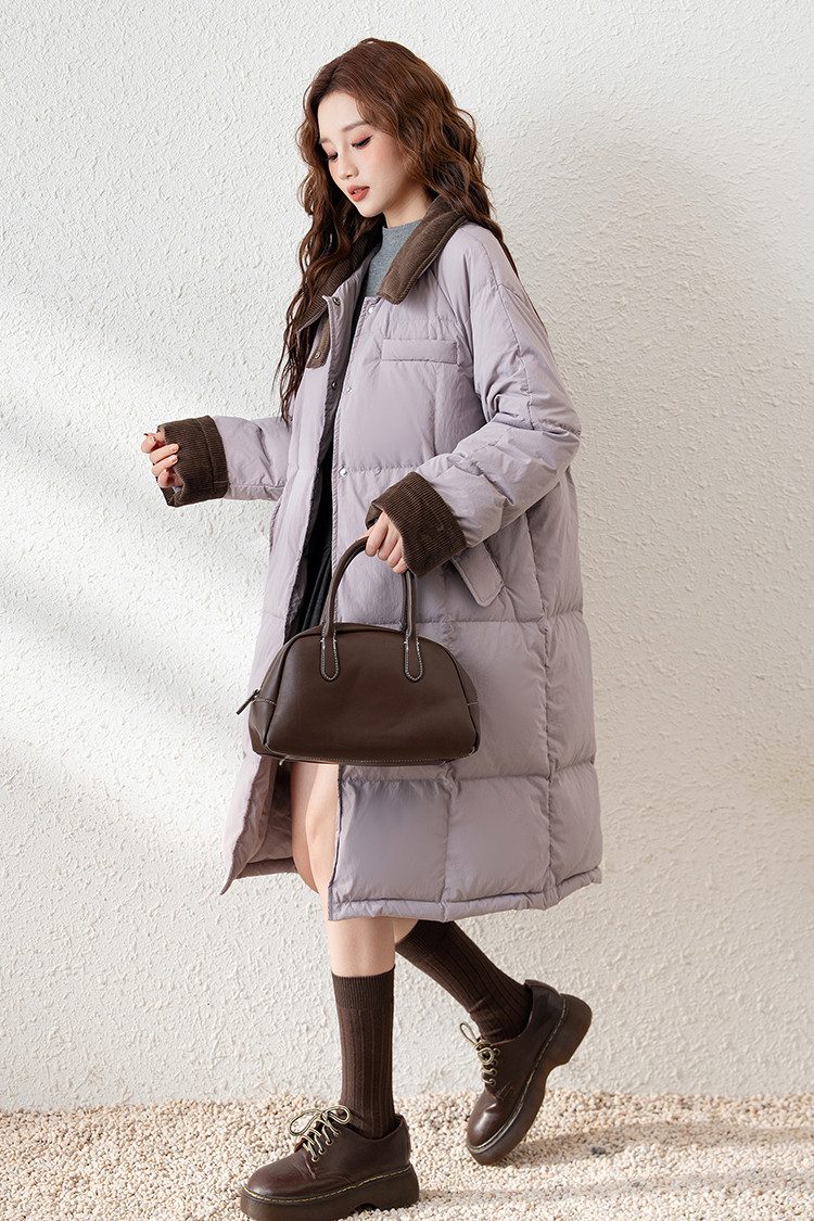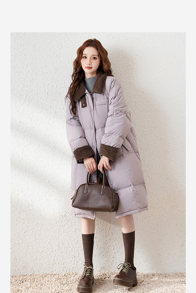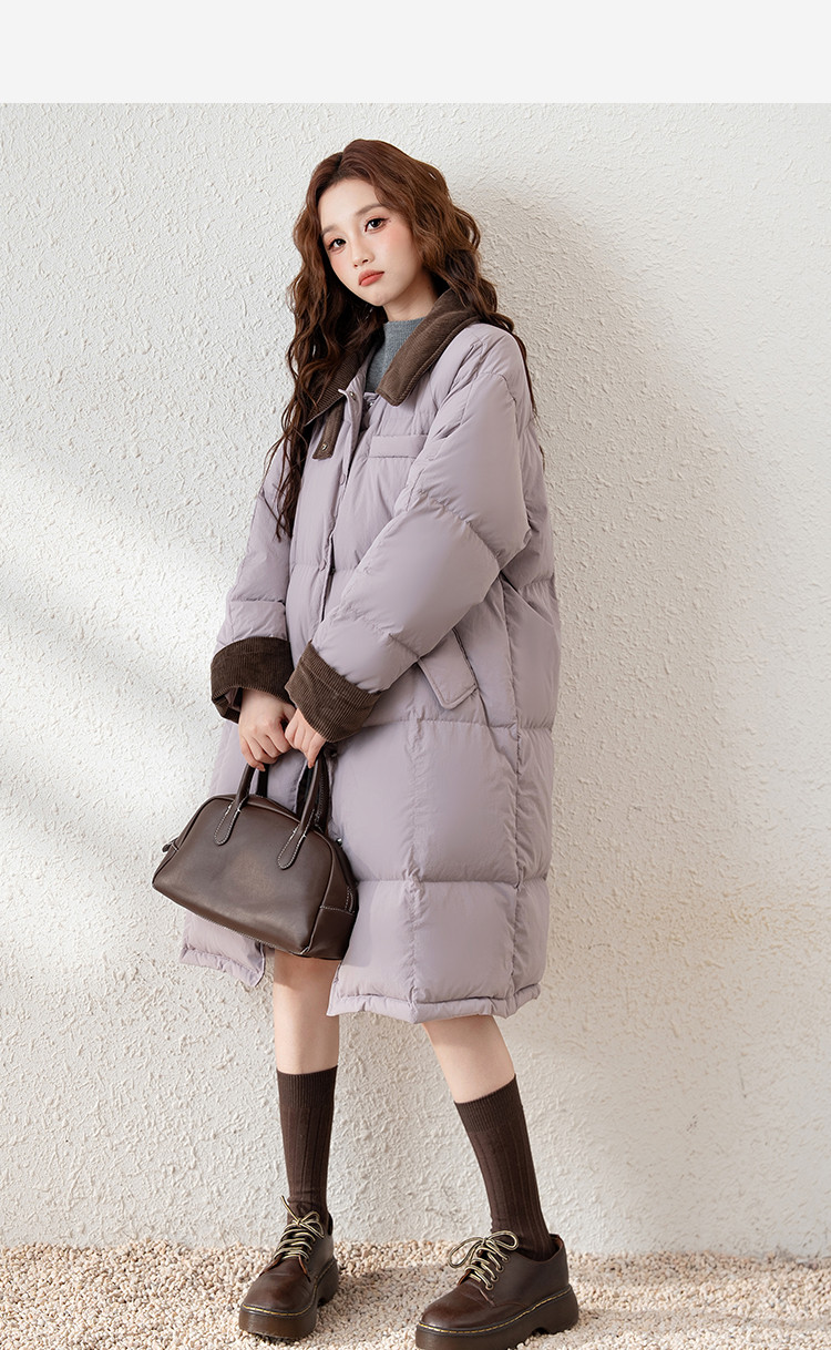 唐狮2026冬季长款羽绒服女过膝翻领拼接灯芯绒撞色宽松休闲风时尚