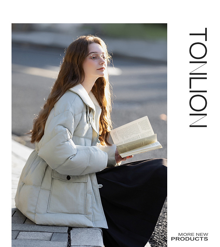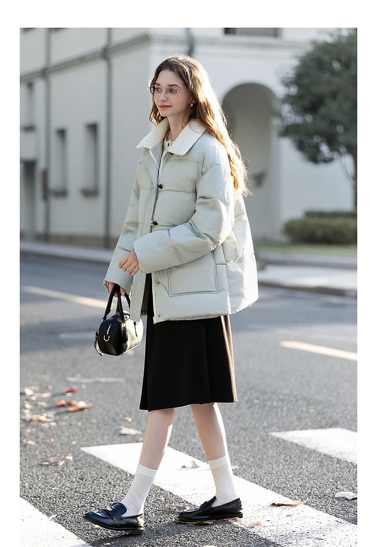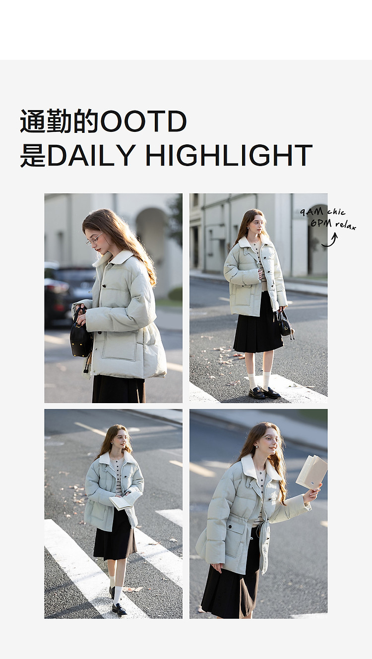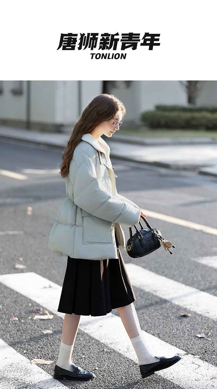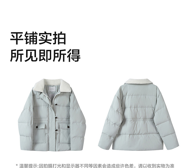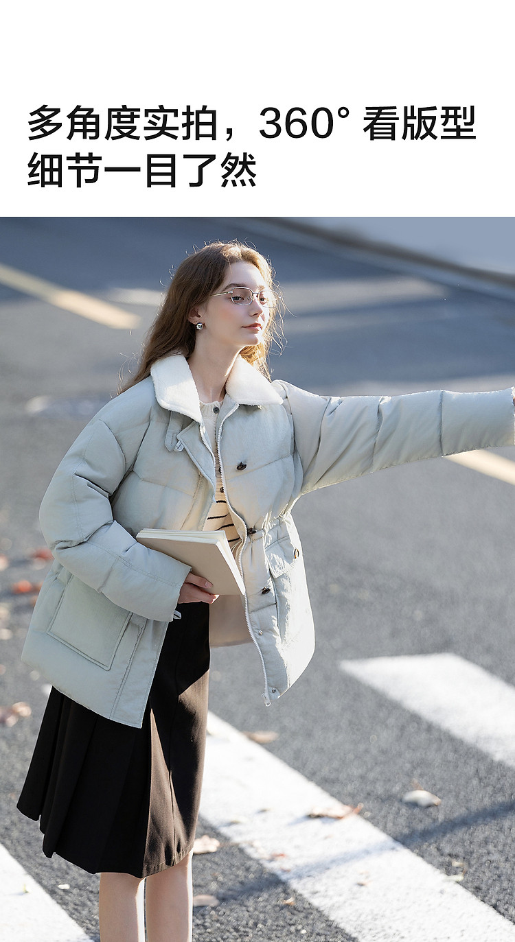 唐狮2026冬季短款羽绒服女拼接仿羊羔毛翻领超好看羽绒收腰设计感