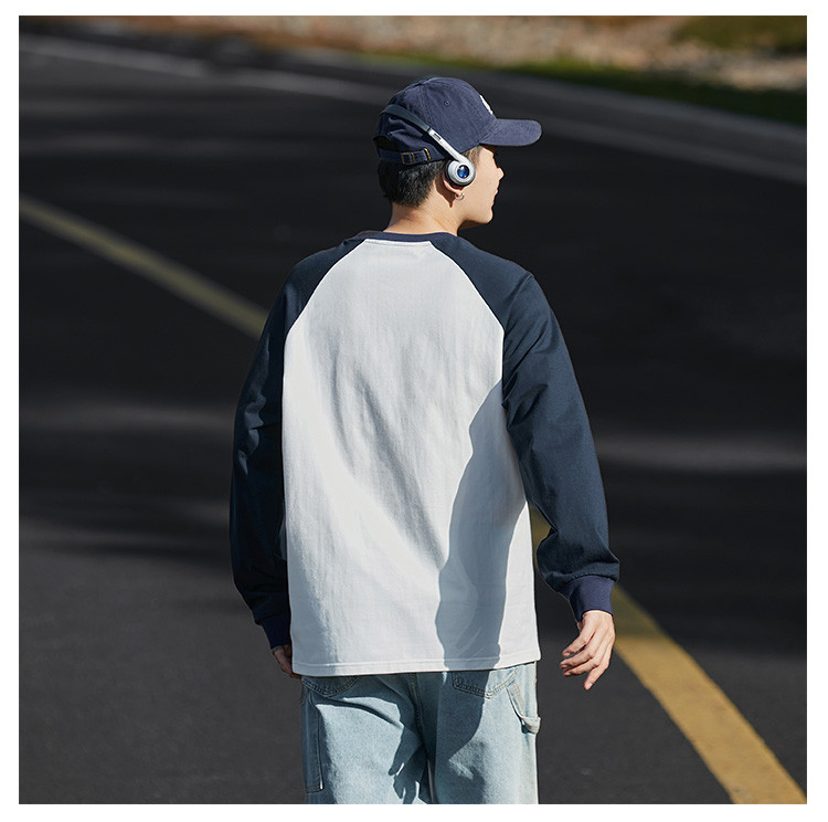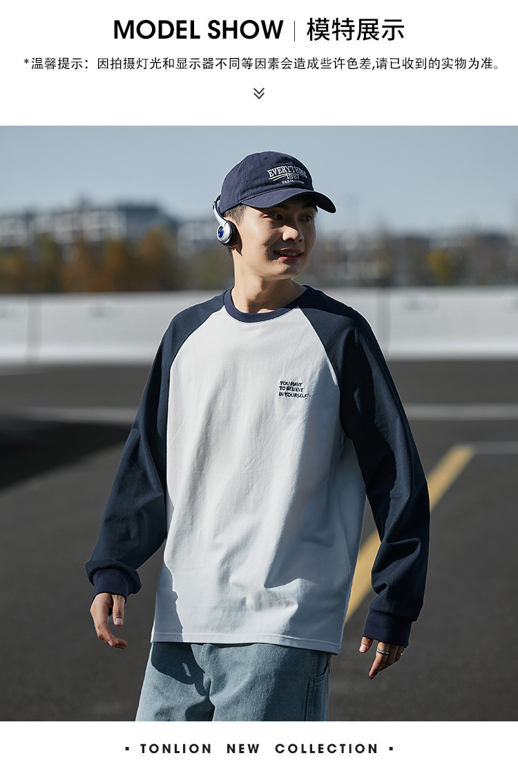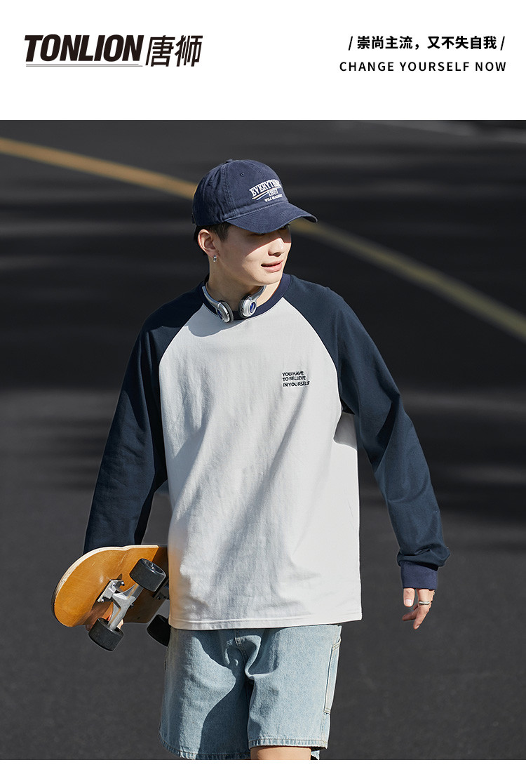 唐狮春秋季新款长袖T恤男撞色拼接圆领宽松上衣插肩袖打底衫潮t
