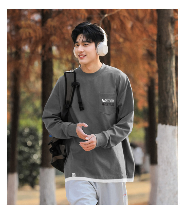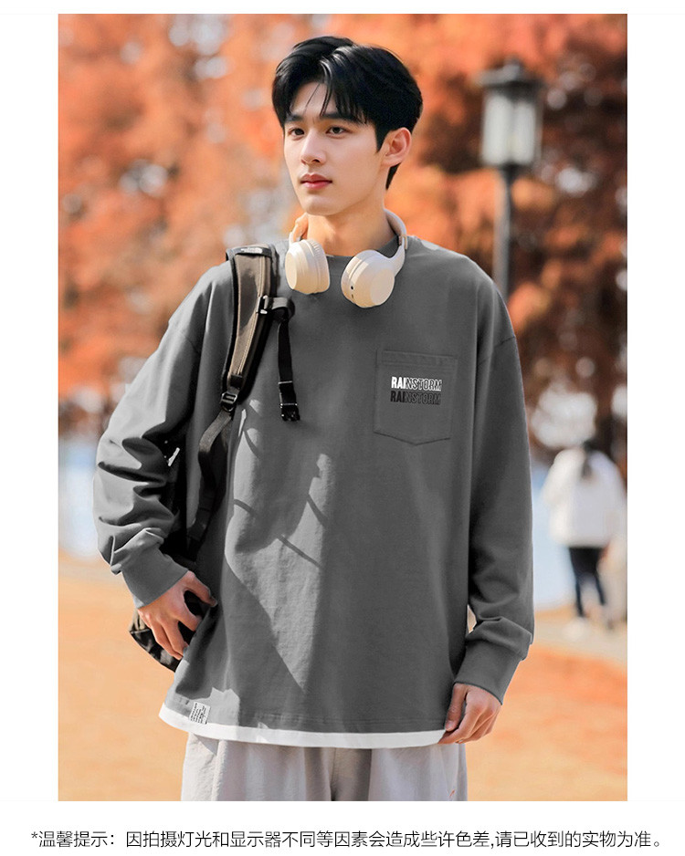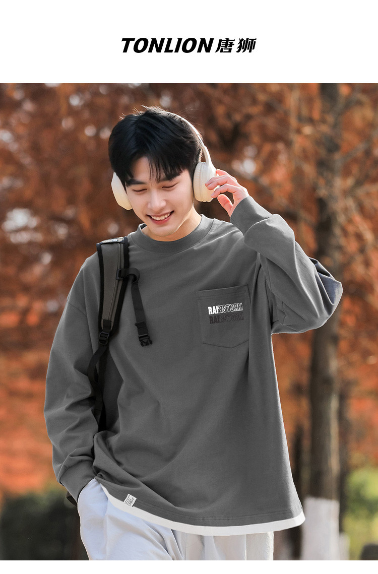 唐狮2025秋季新款长袖T恤男青年假两件印花圆领纯棉打底衫韩版潮