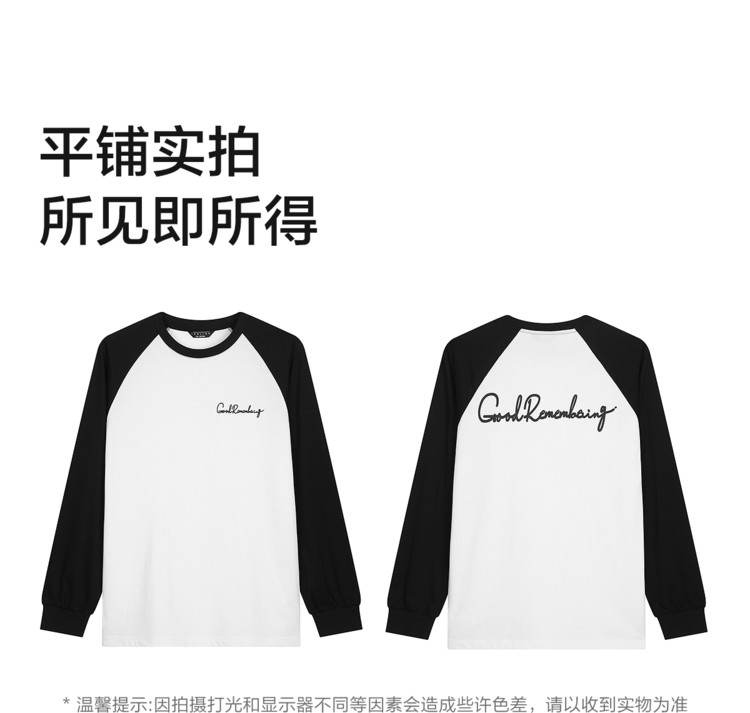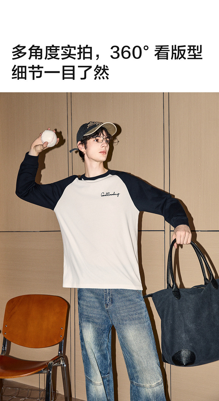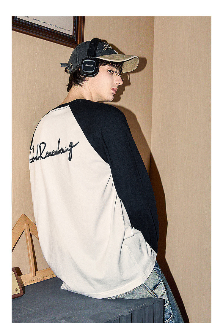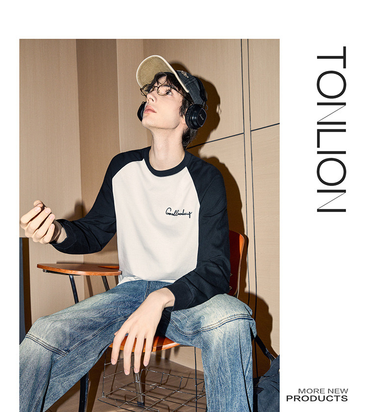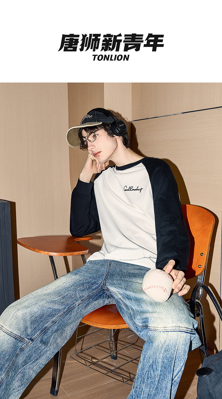 唐狮2025春秋季男款圆领长袖T恤字母发泡印撞色插肩袖设计感T恤