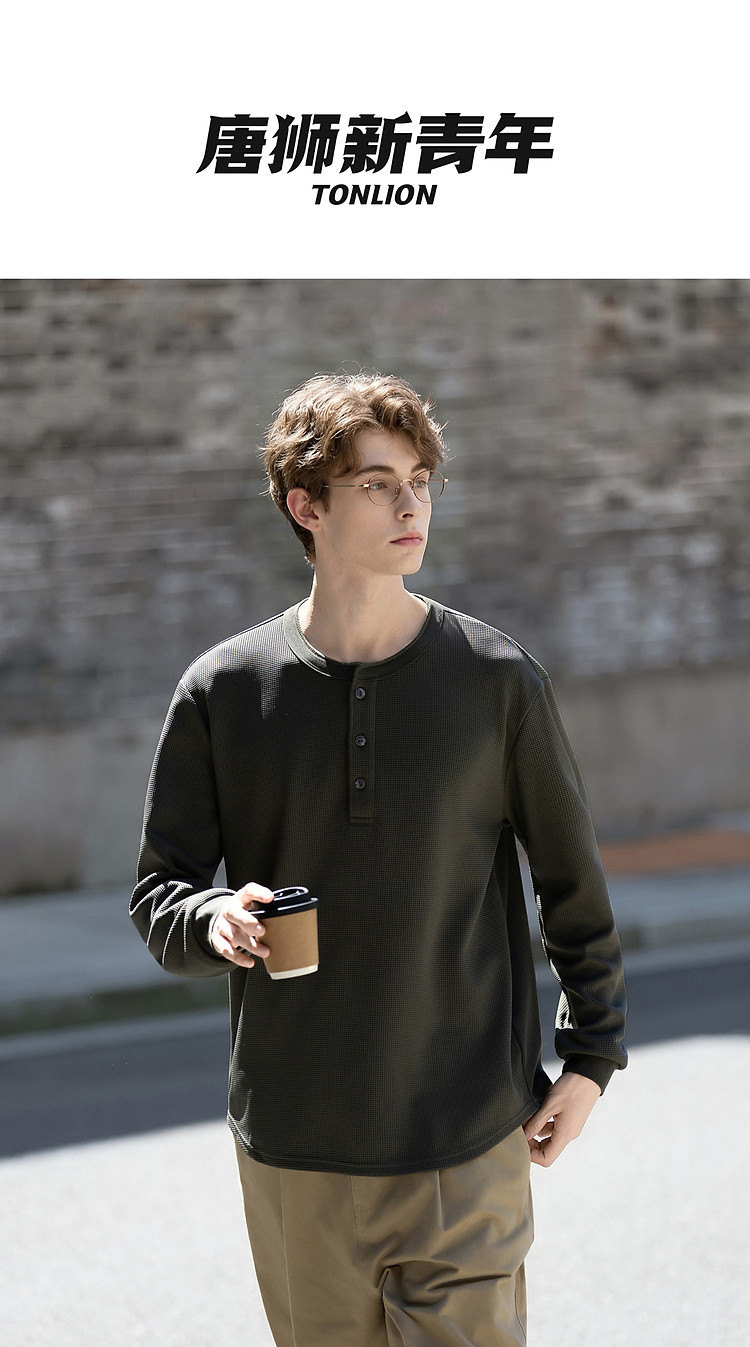 唐狮2026秋季新款长袖T恤男肌理亨利领纽扣圆领宽松上衣男内搭潮t