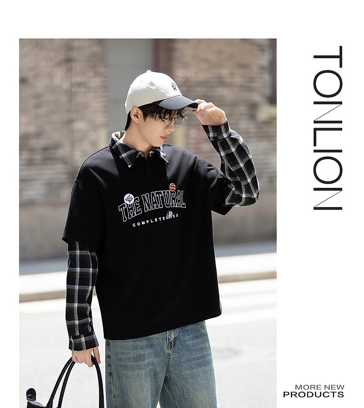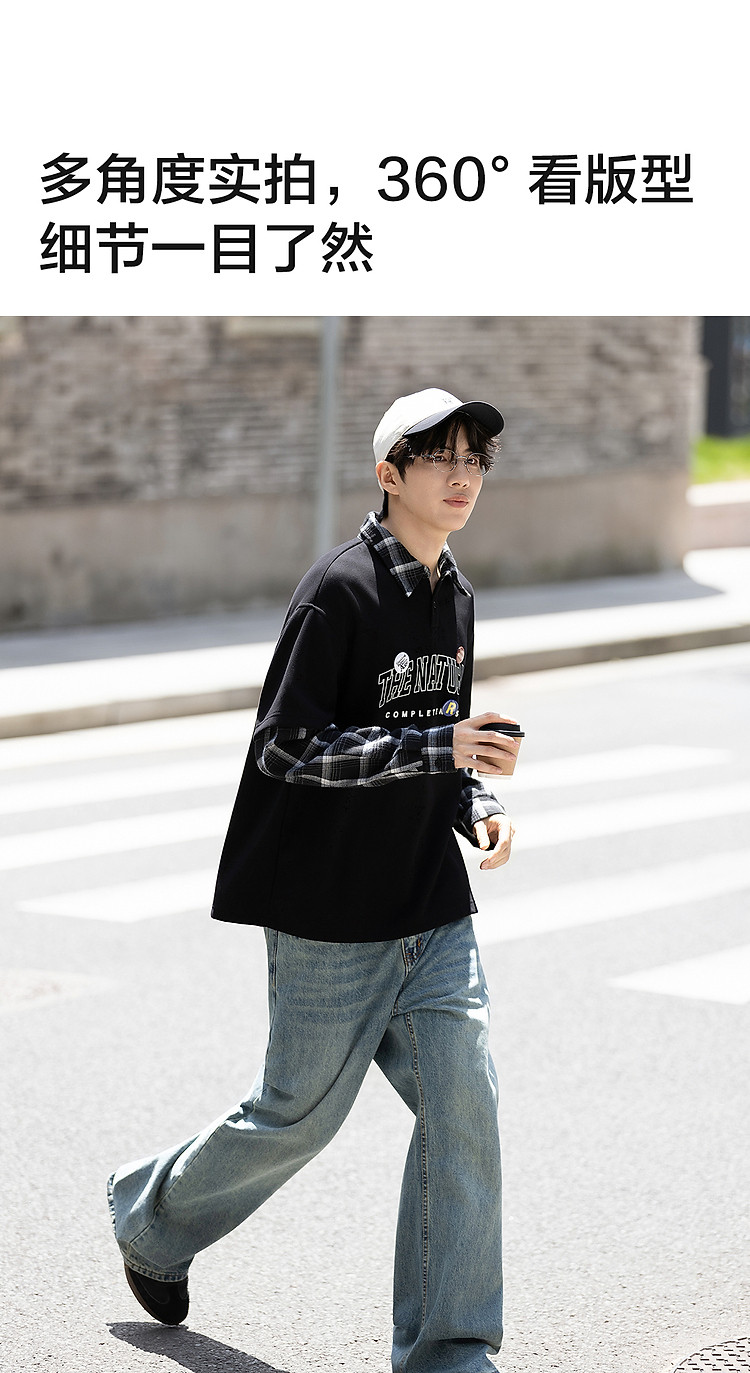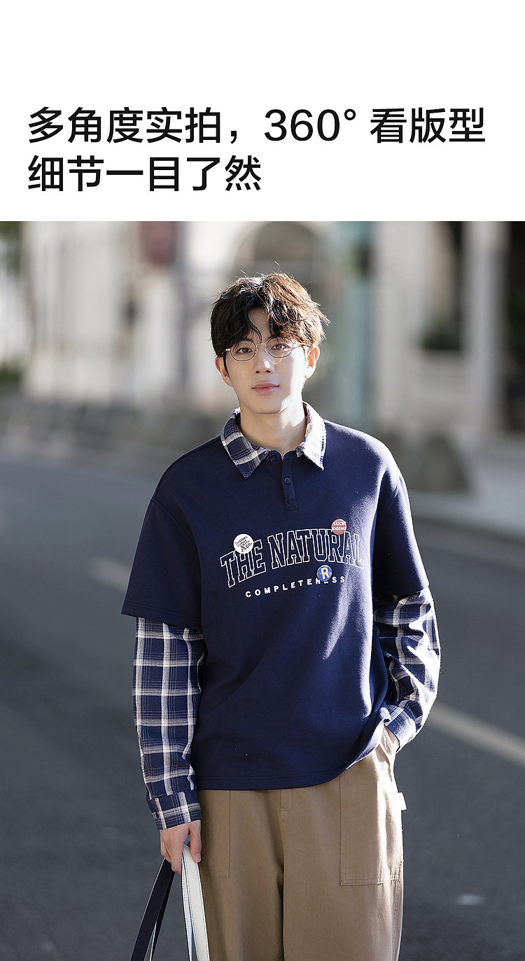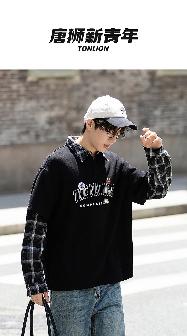 唐狮男款长袖polo2026春秋新款假两件字母印花设计感独特翻领上衣