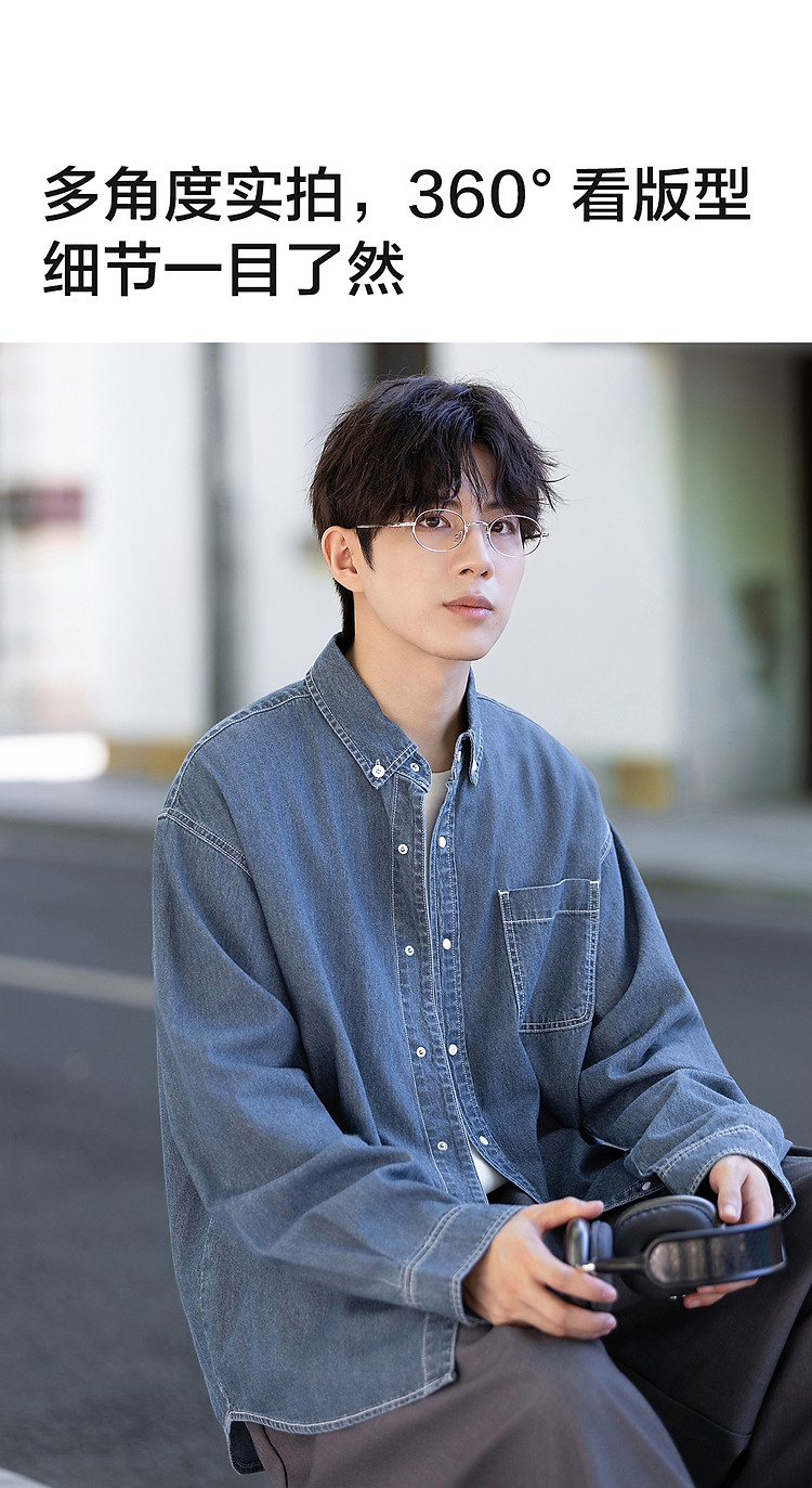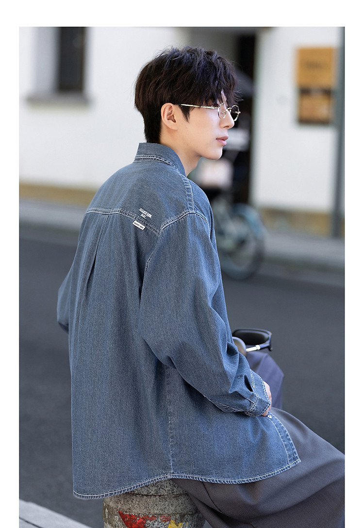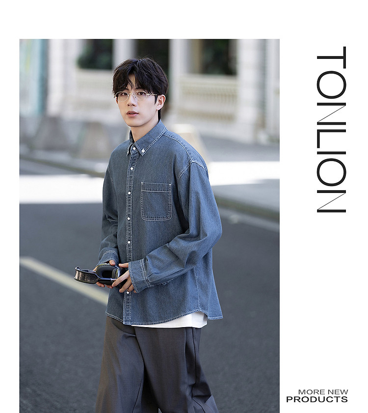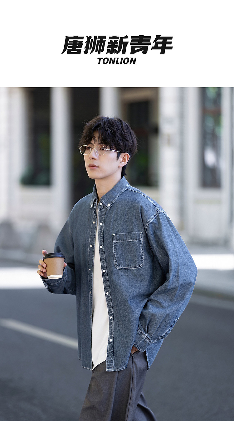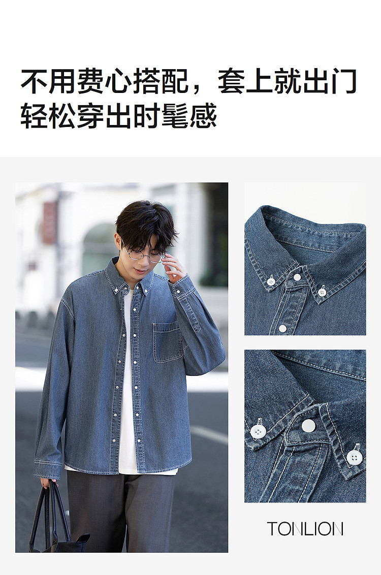 唐狮2026秋冬男士牛仔长袖衬衫钉扣领翻领外穿单口袋休闲时尚衬衫