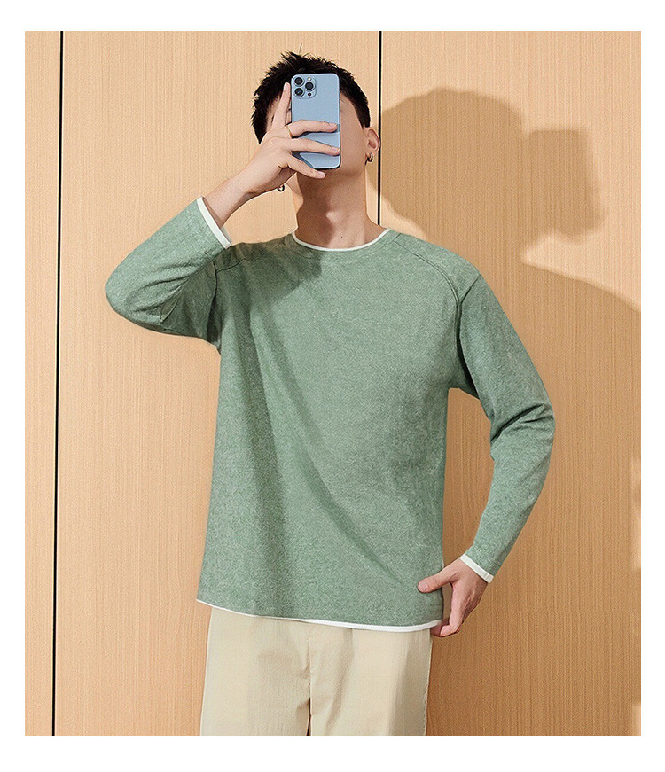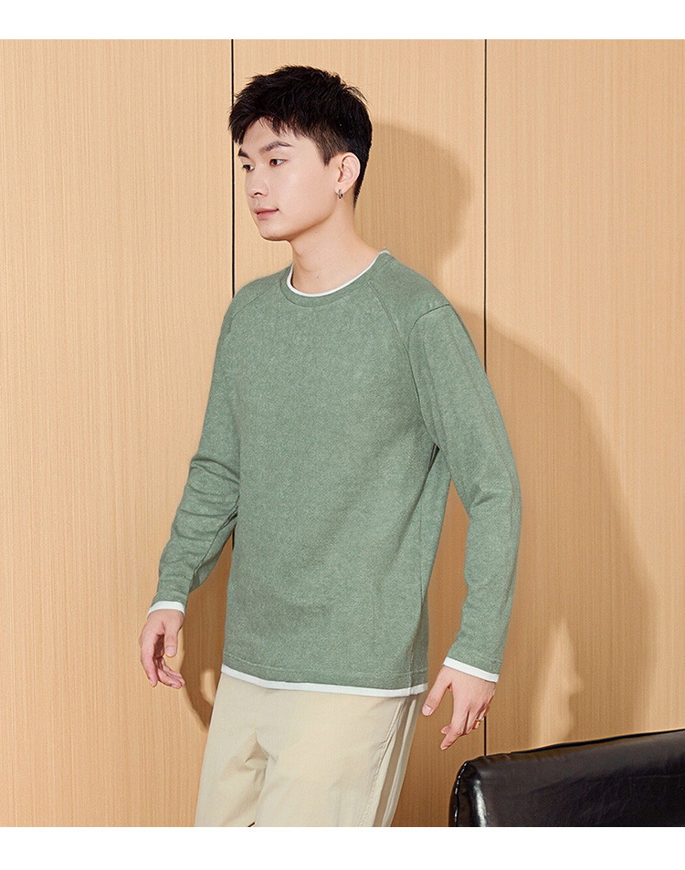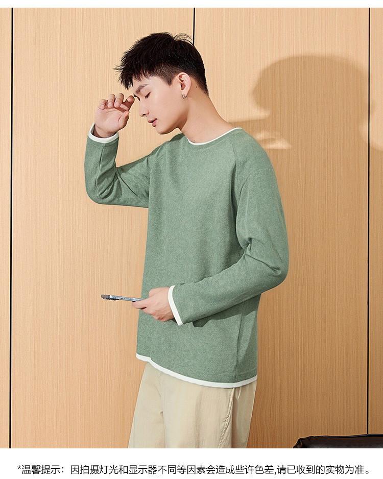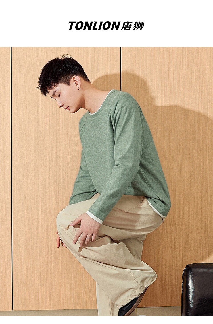 唐狮2026秋季男士圆领长袖T恤男款基础净色假两件休闲宽松慵懒风