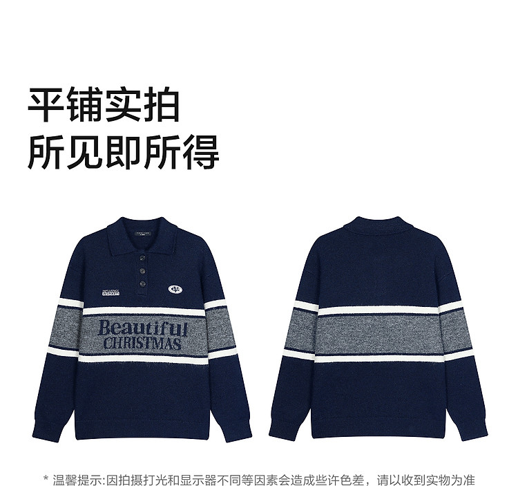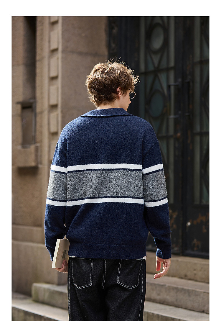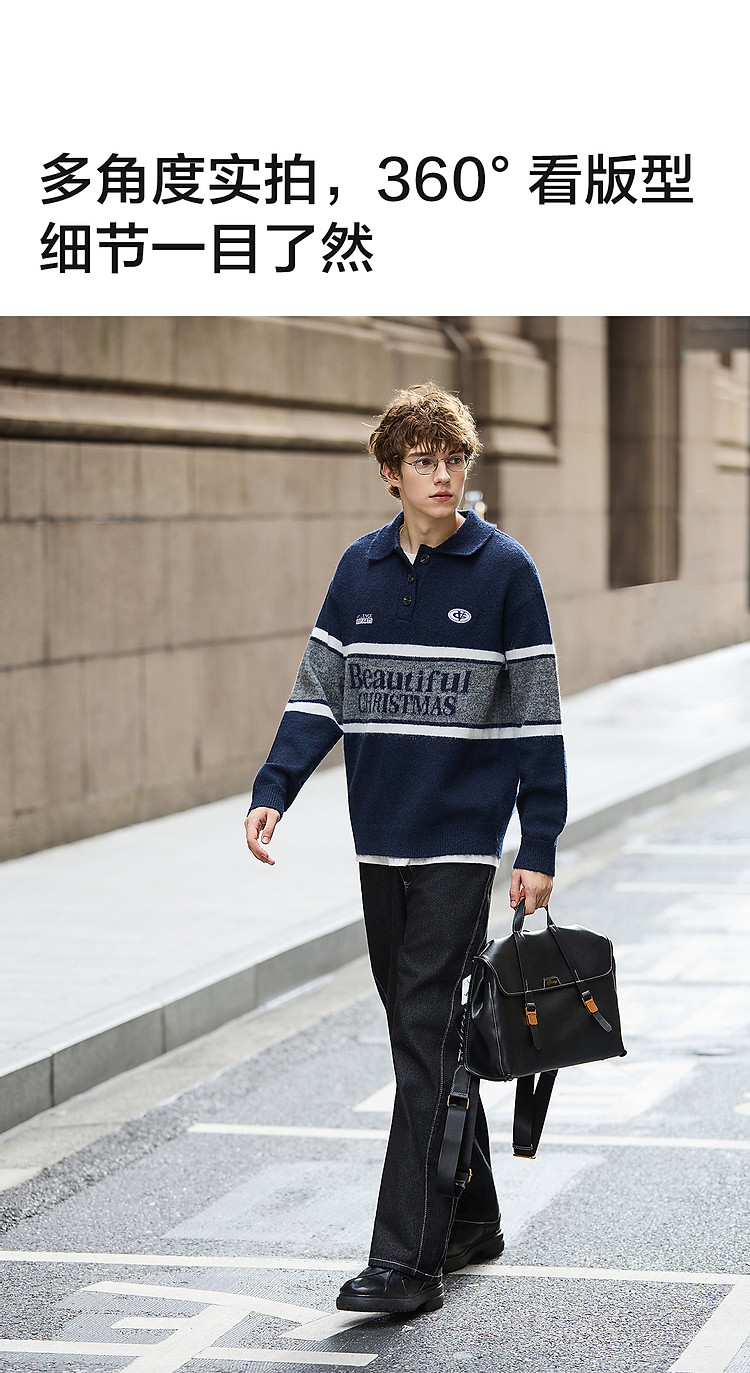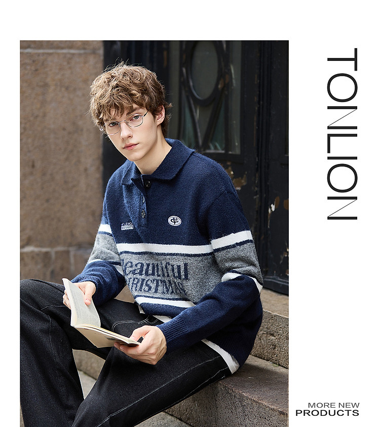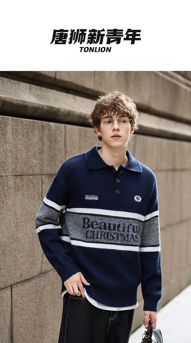 唐狮2026新款秋冬季毛衣男翻领英文拼接学院风学生美式穿搭时尚