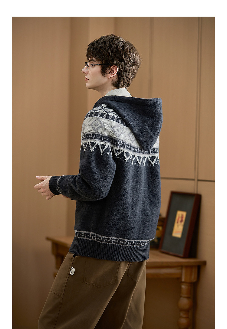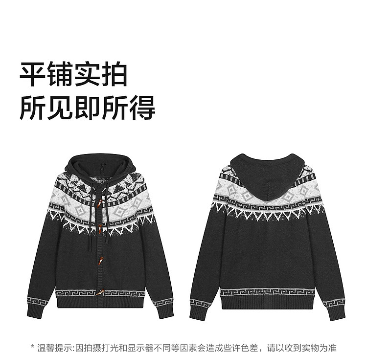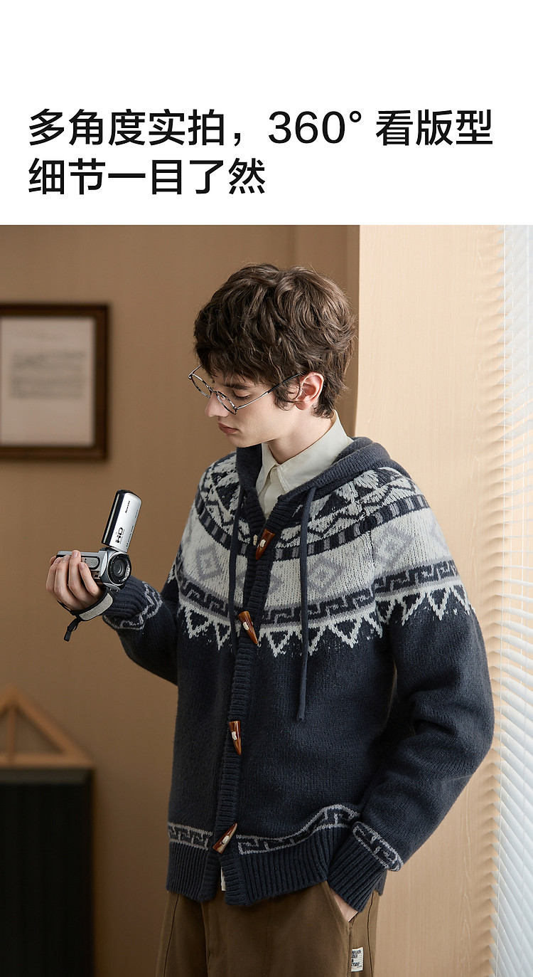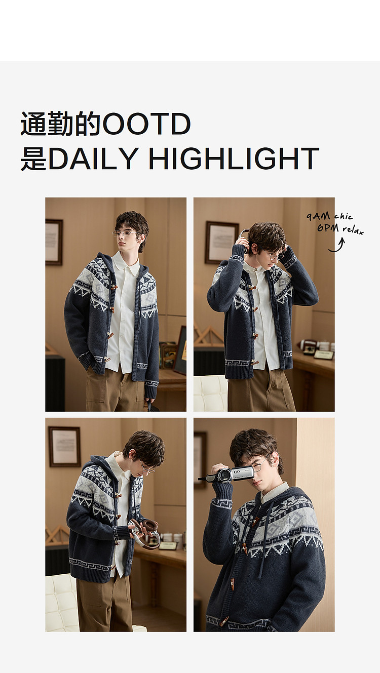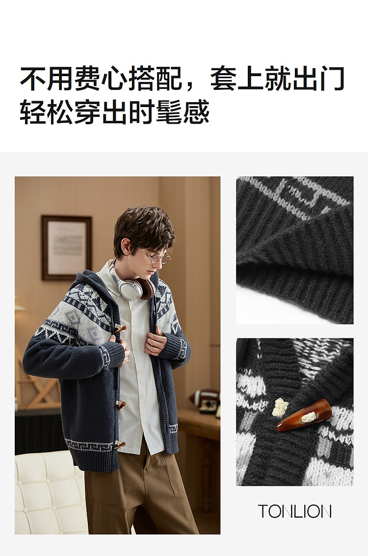 唐狮2026秋冬季男开衫毛衣连帽费尔岛设计感时尚仿牛角扣毛线衫