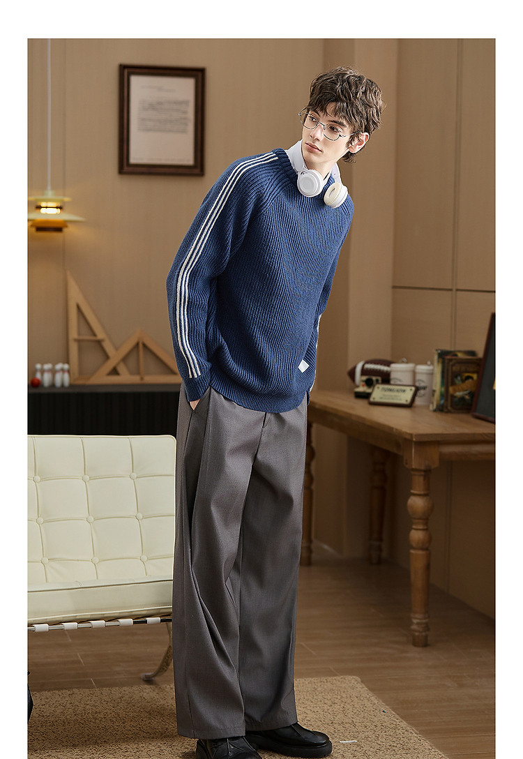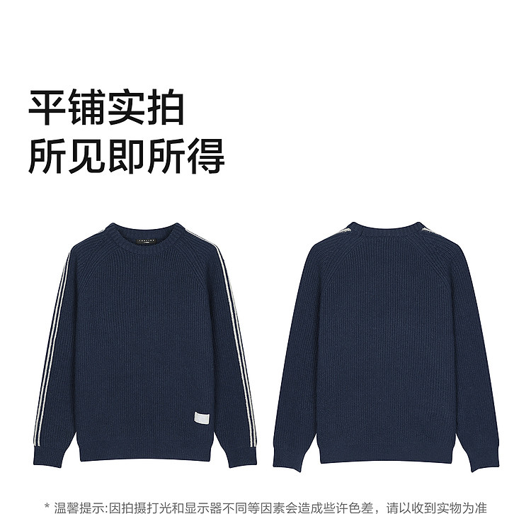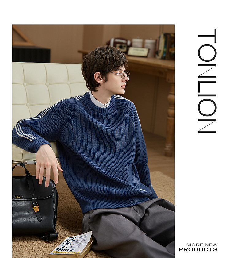 唐狮2026秋冬季毛衣男圆领套头小V撞色明线德美拉肌理感毛线衫