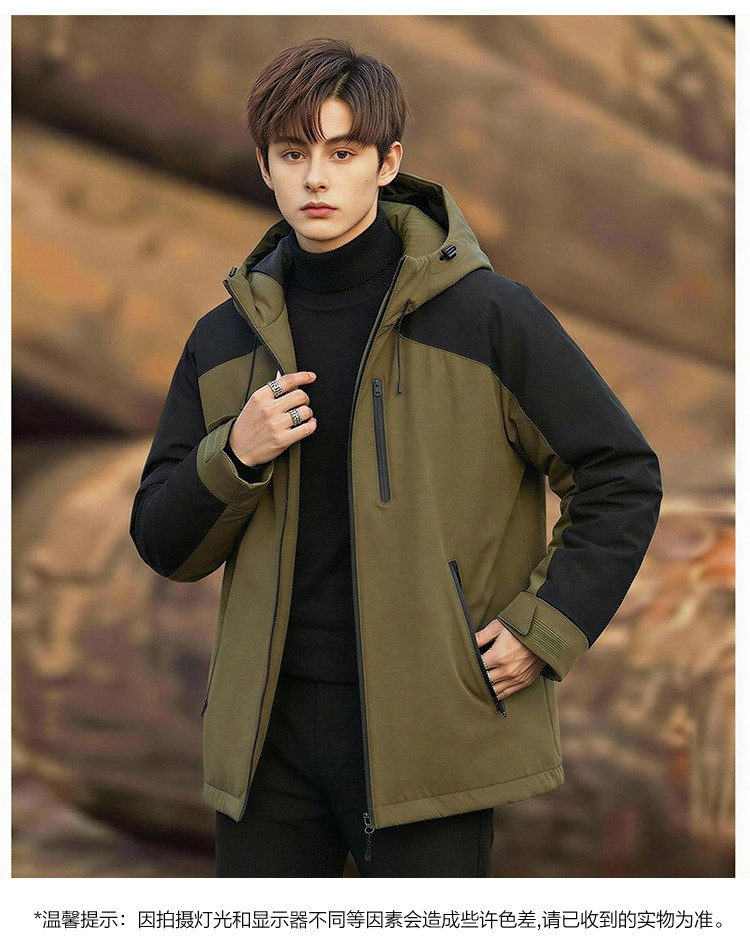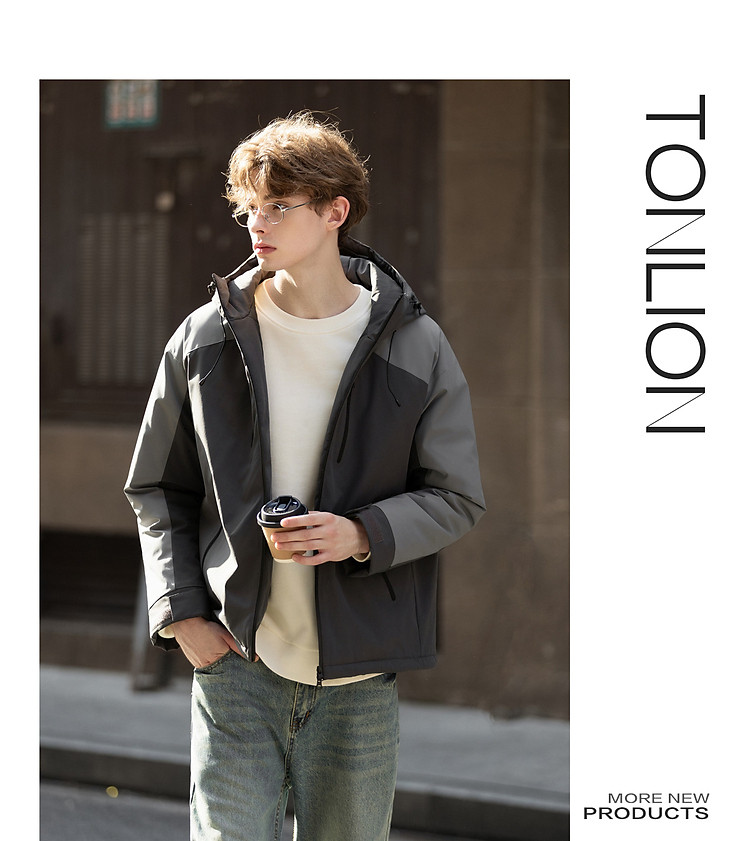 唐狮2024新款男生连帽羽绒服撞色拼接前胸印花短款面包服潮流宽松
