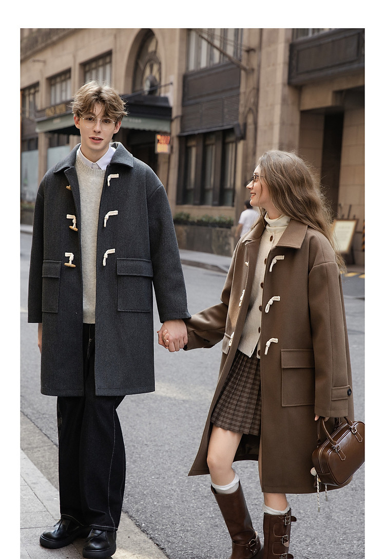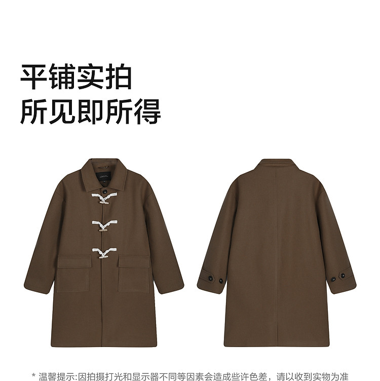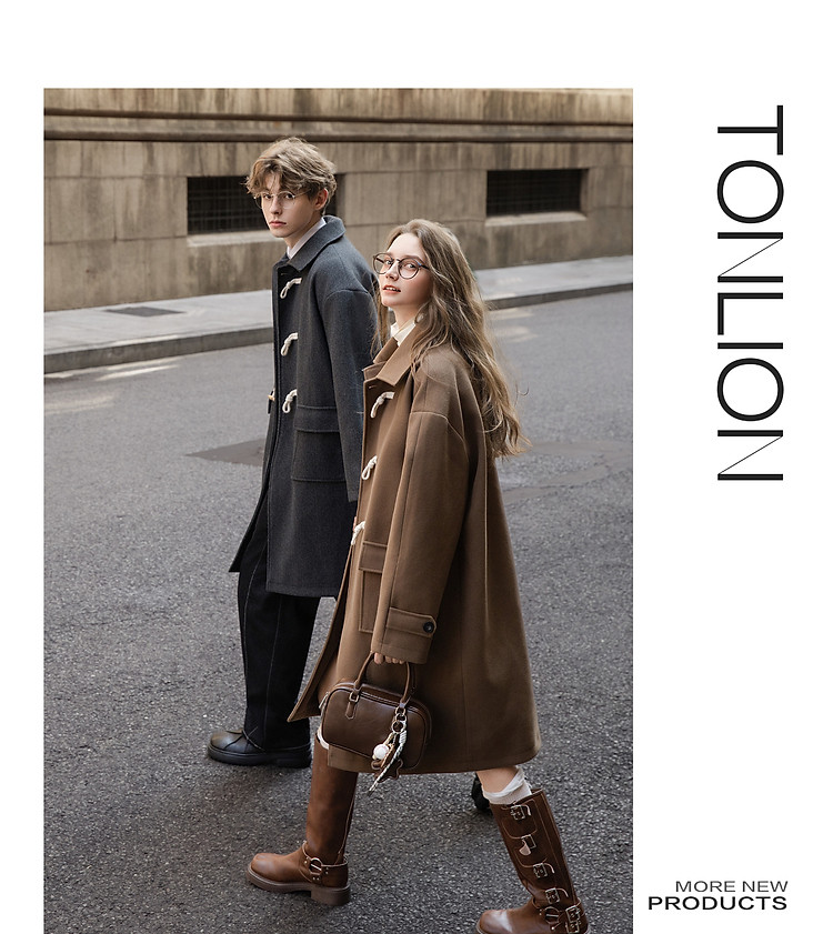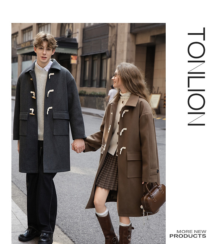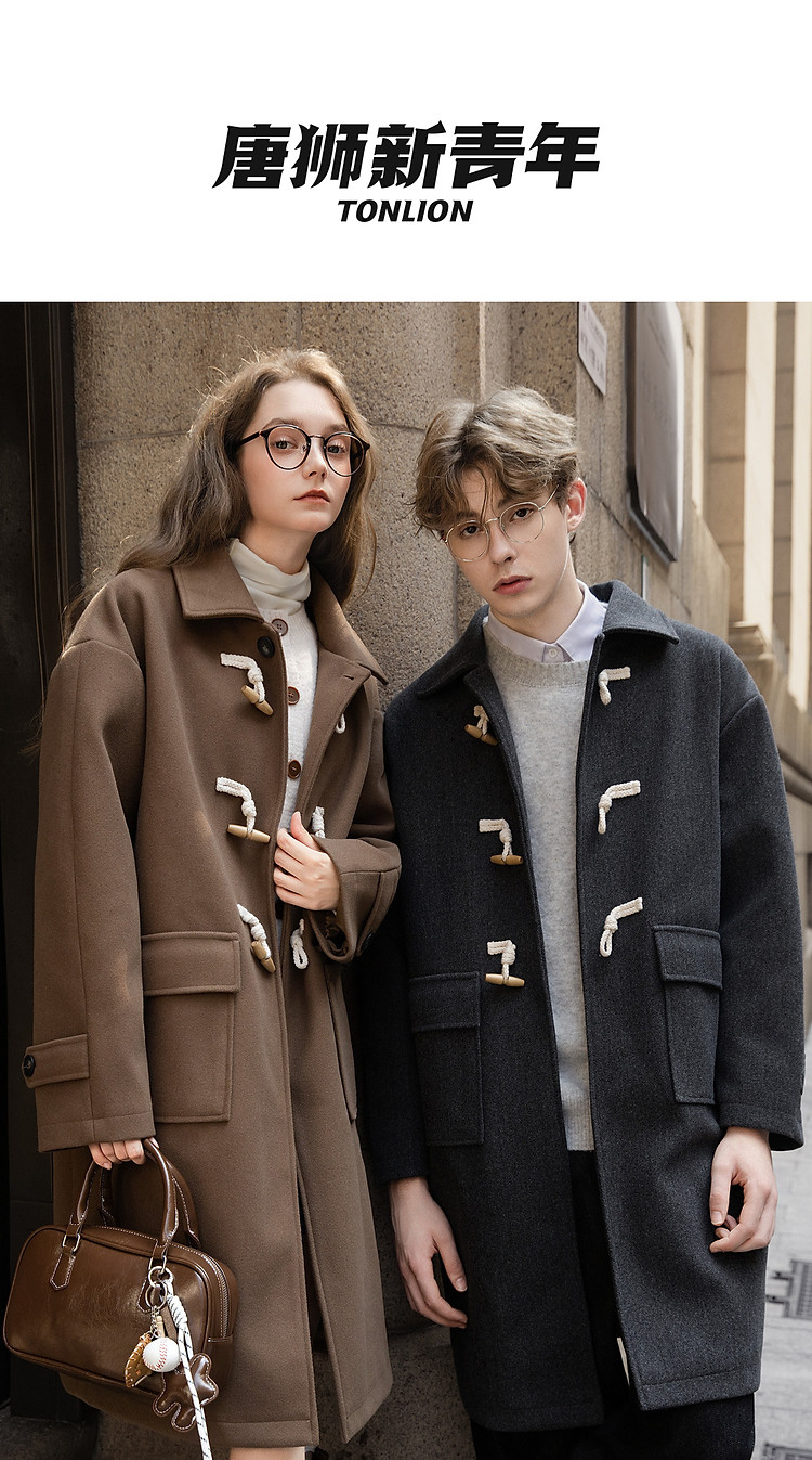 唐狮2026秋冬季中长款毛呢外套加厚情侣款翻领简约风仿牛角扣时尚