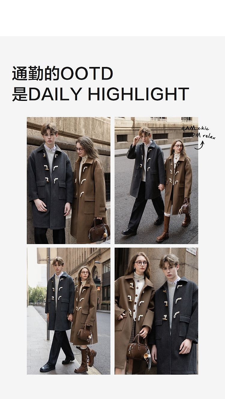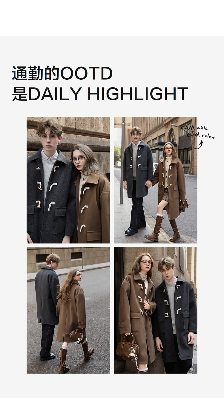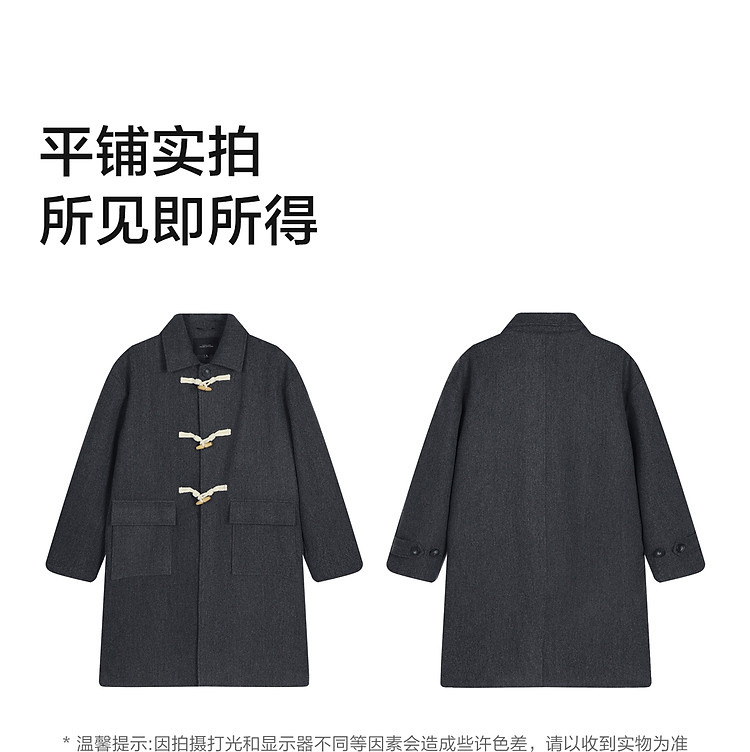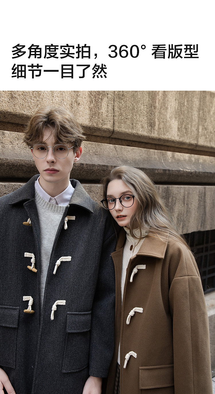 唐狮2026秋冬季中长款毛呢外套加厚情侣款翻领简约风仿牛角扣时尚