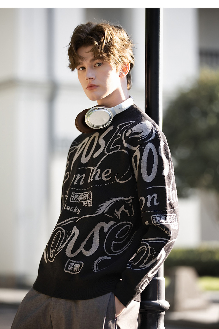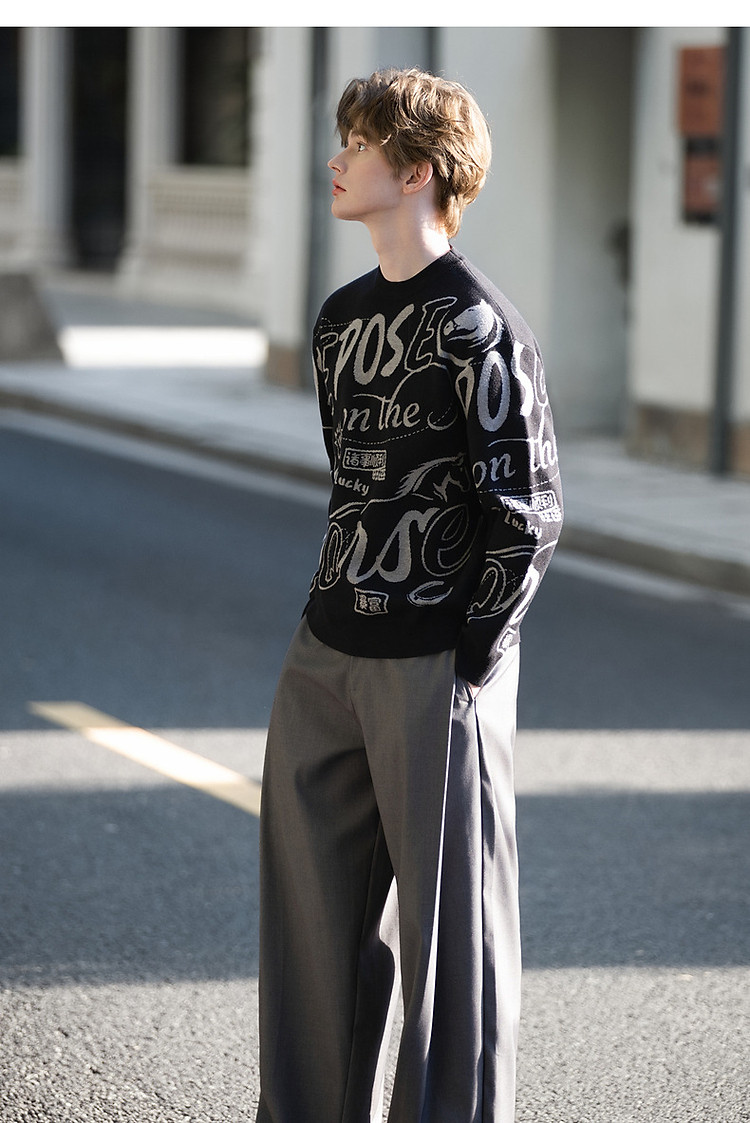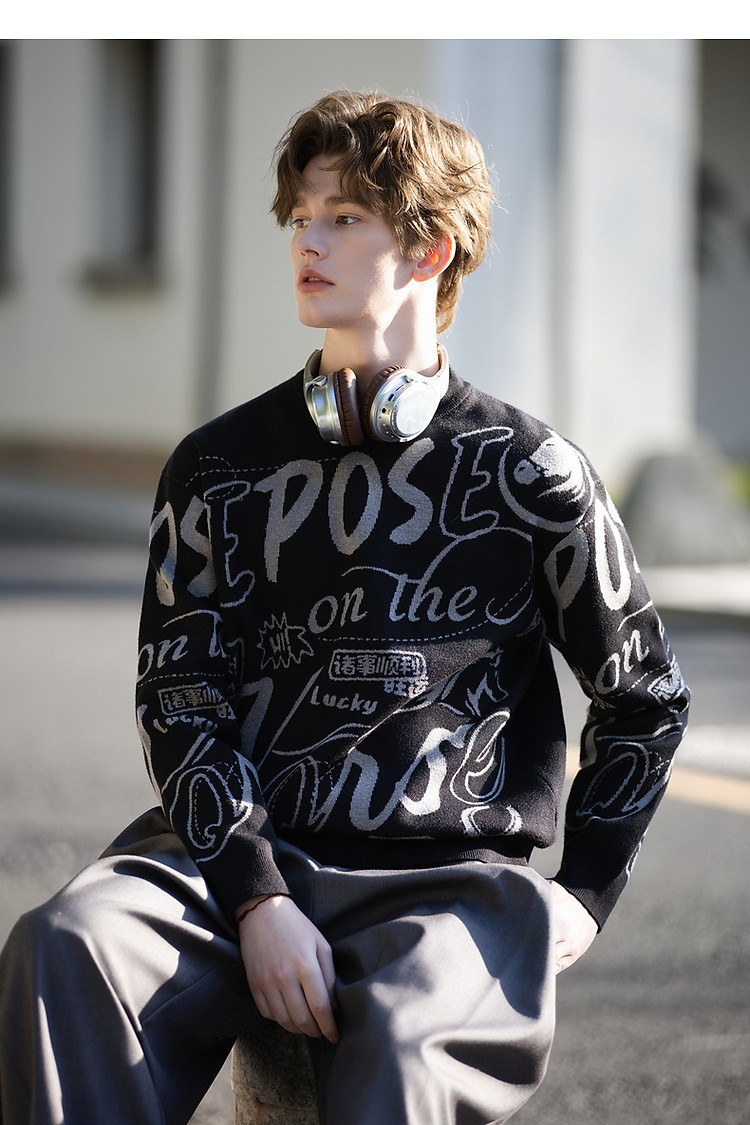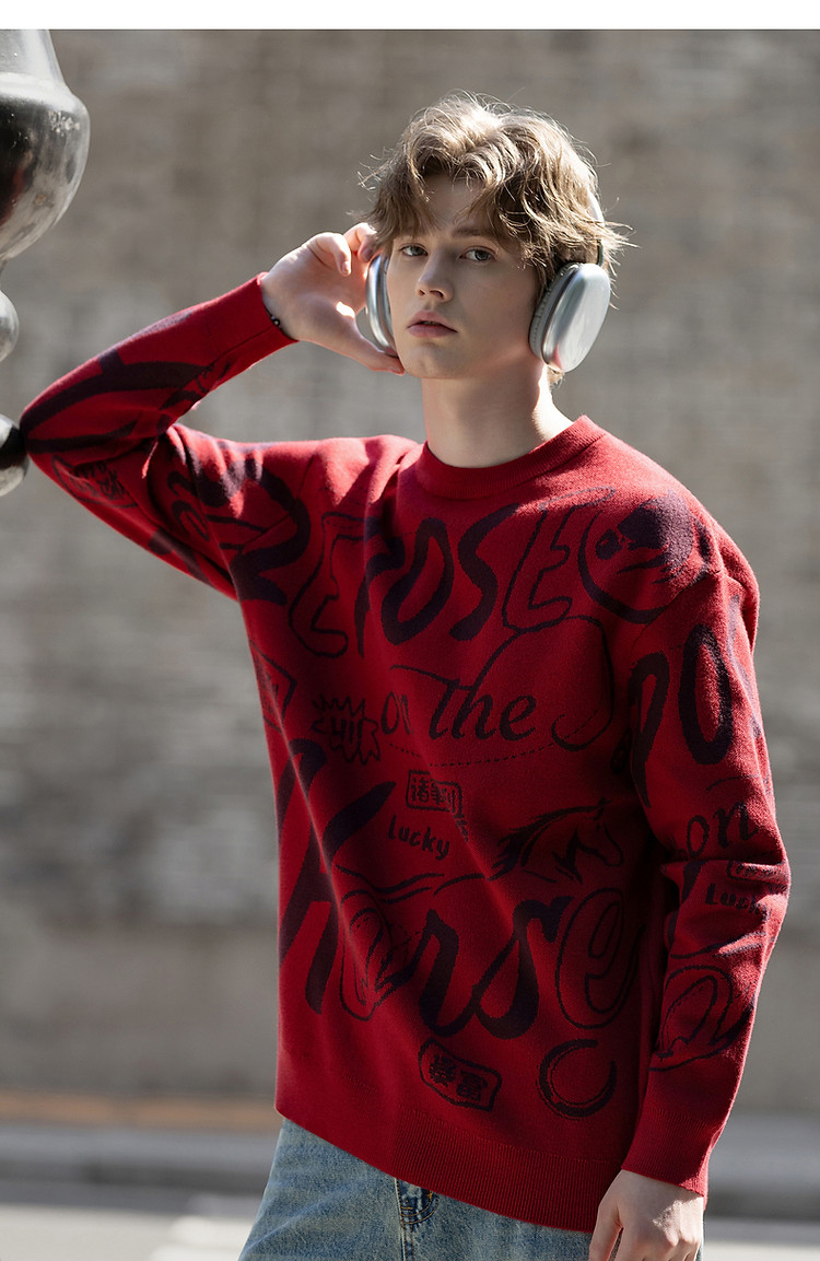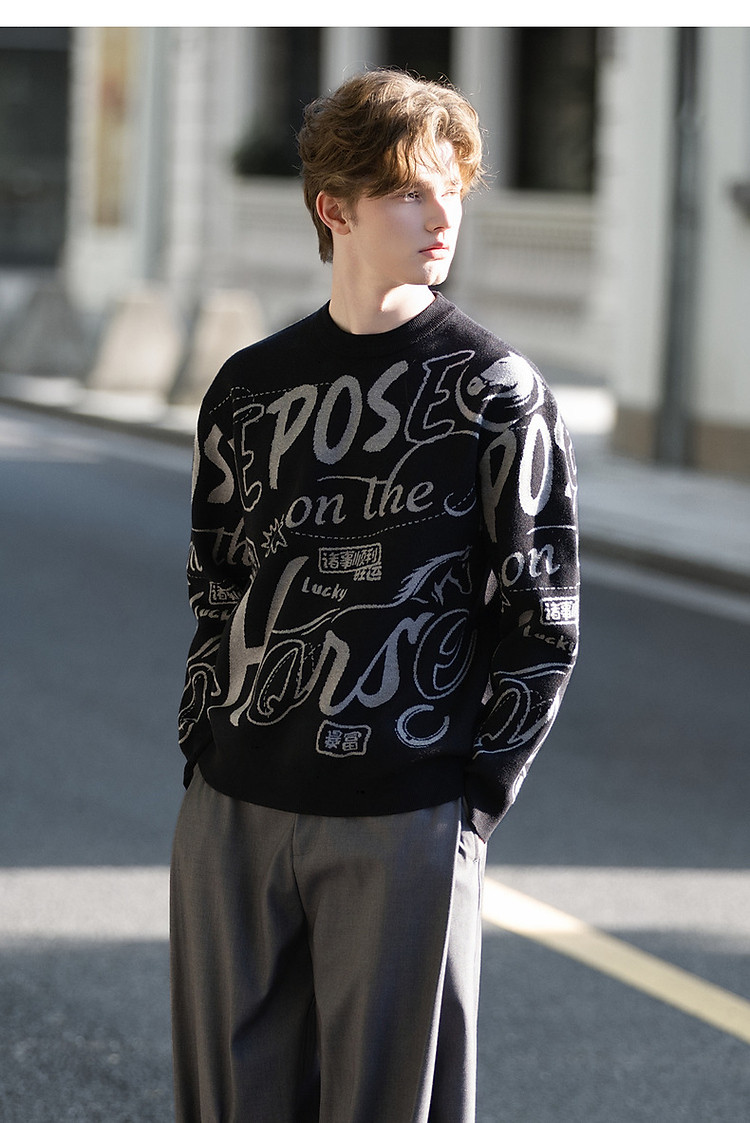 唐狮2026秋冬情侣同码圆领满印大文字图案毛线衫休闲宽松百搭