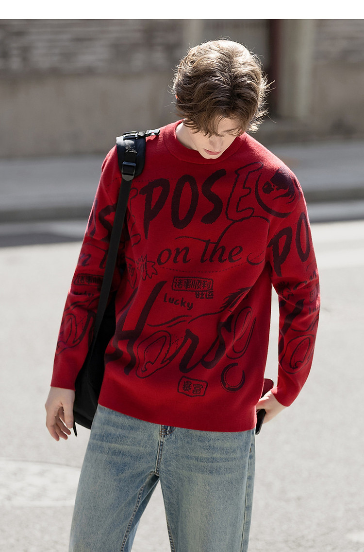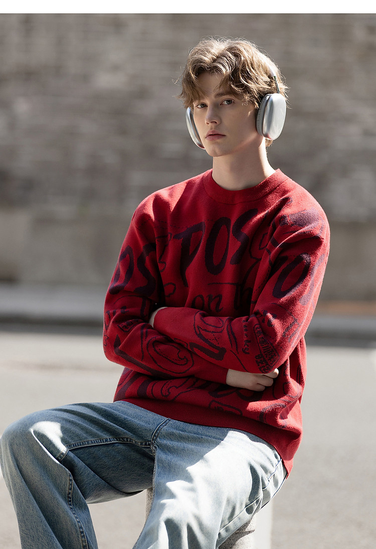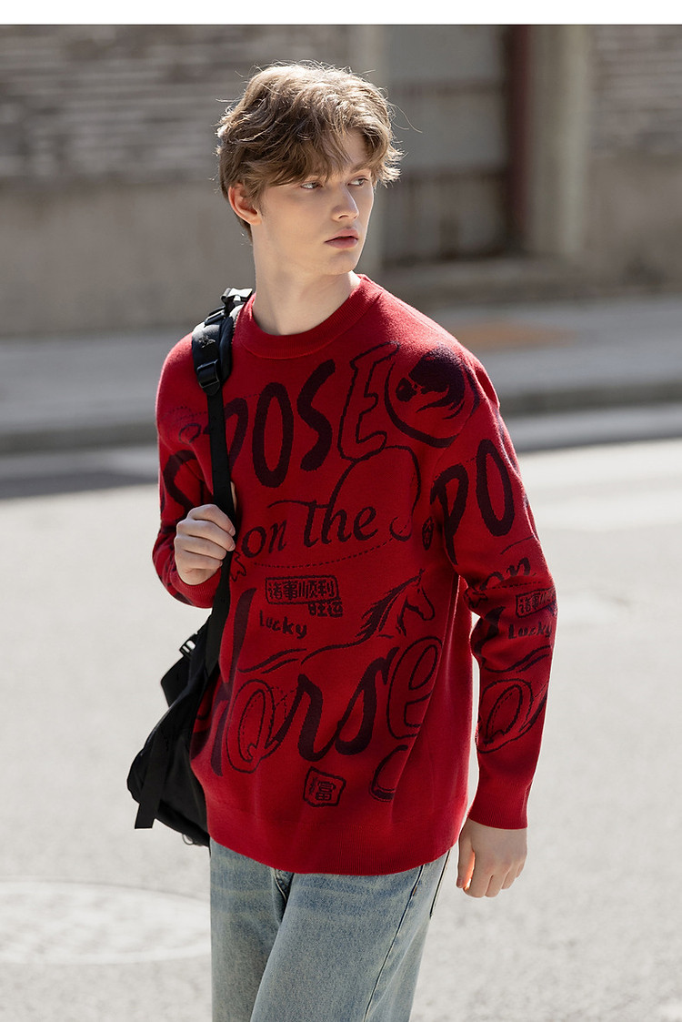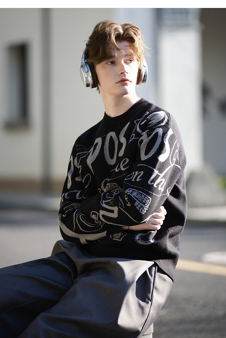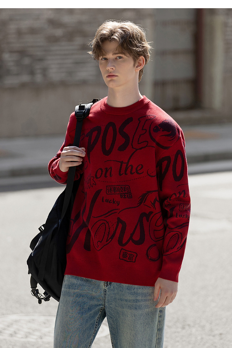 唐狮2026秋冬情侣同码圆领满印大文字图案毛线衫休闲宽松百搭