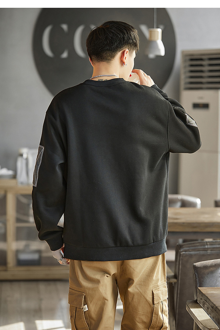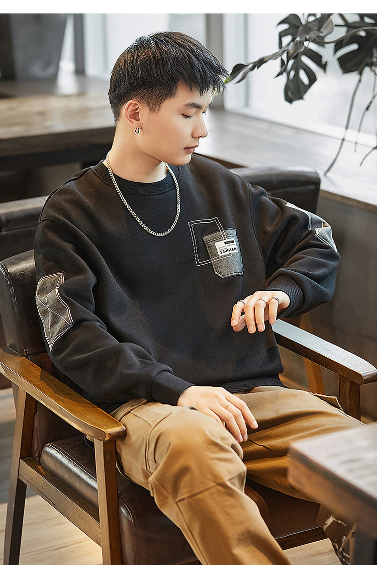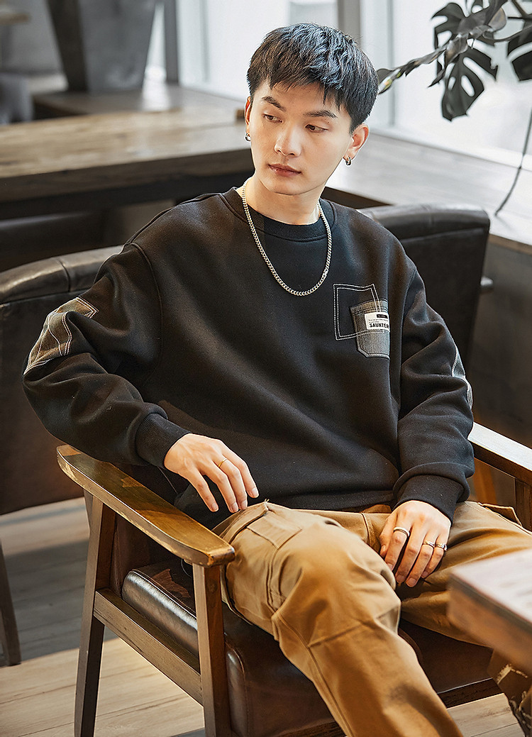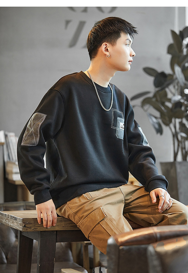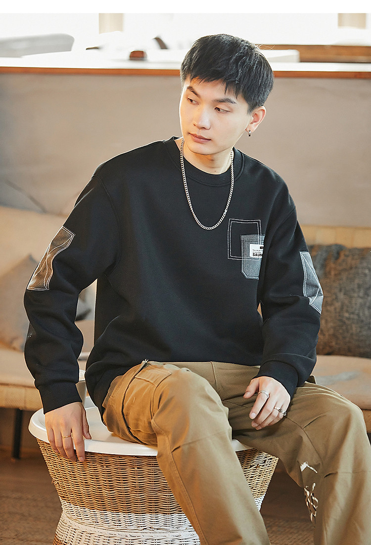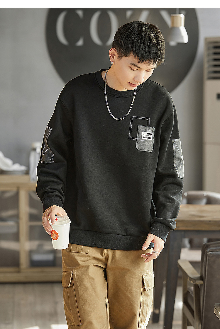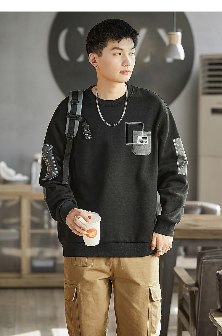 唐狮2026秋冬男圆领加绒拼接卫衣百搭设计感时尚休闲贴布宽松