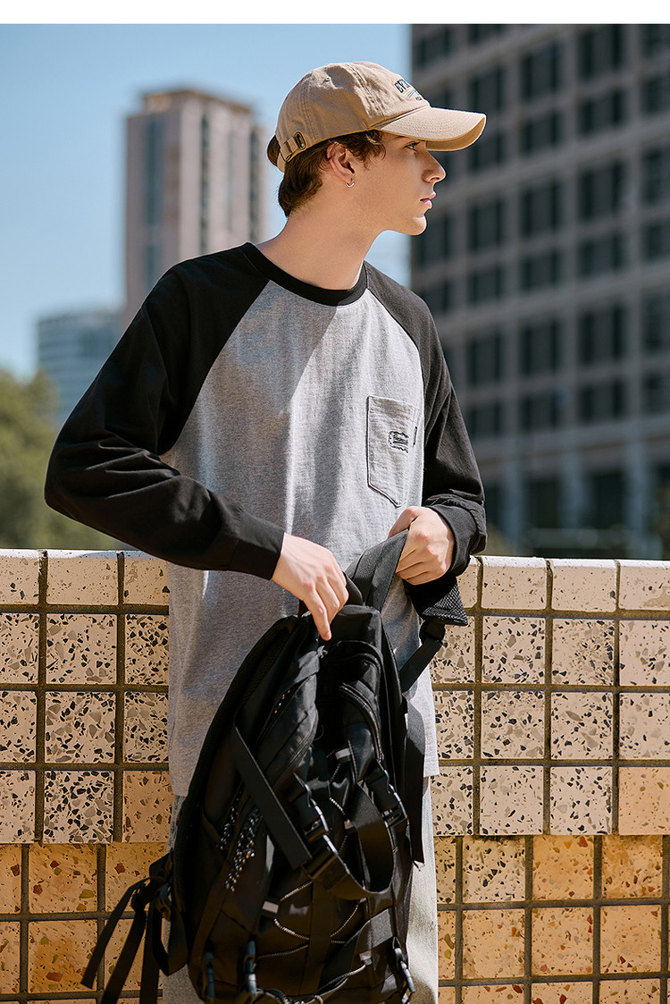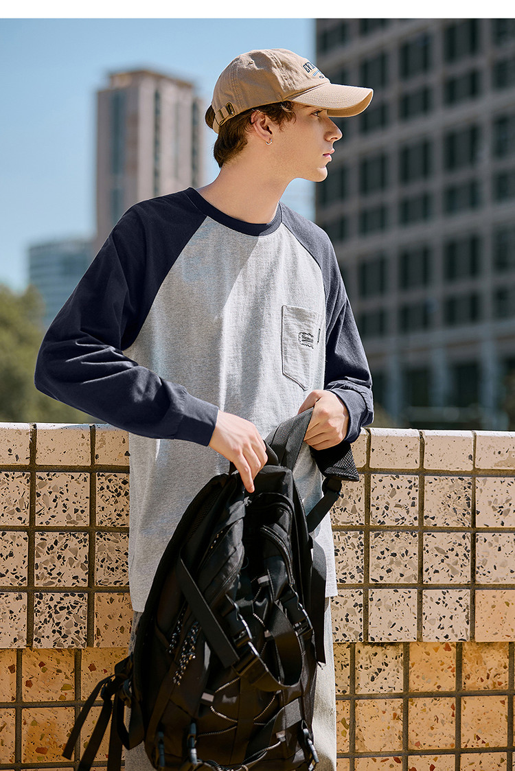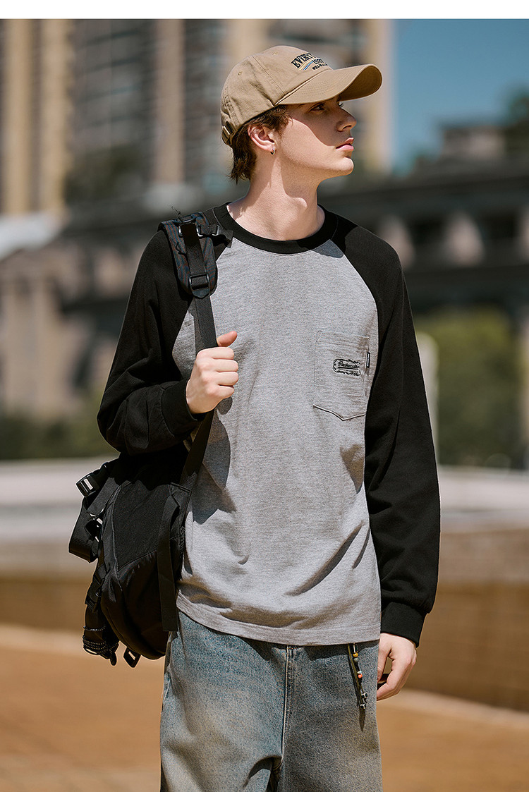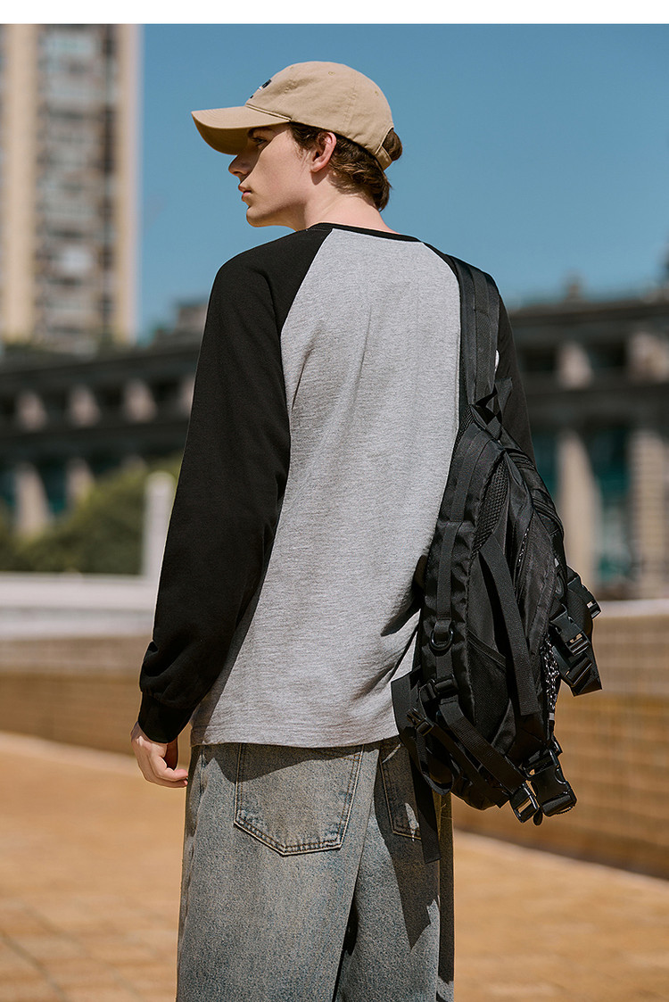 唐狮2025春季新款长袖T恤男撞色拼接上衣宽松插肩袖t设计感打底衫