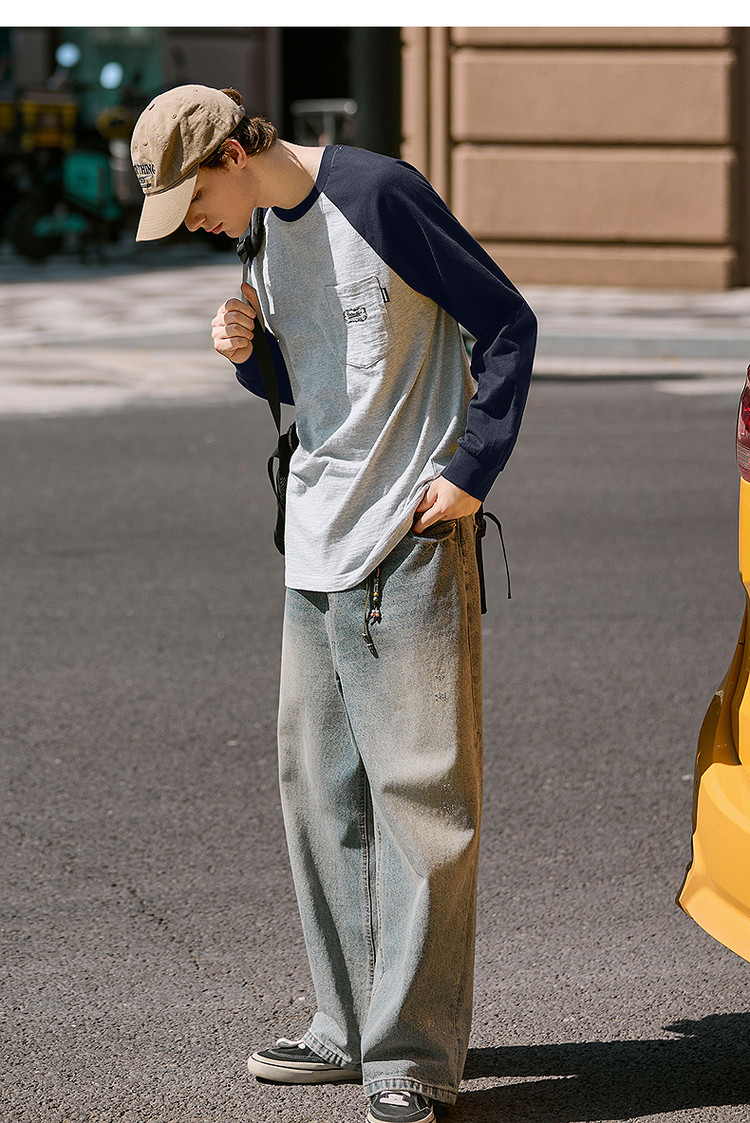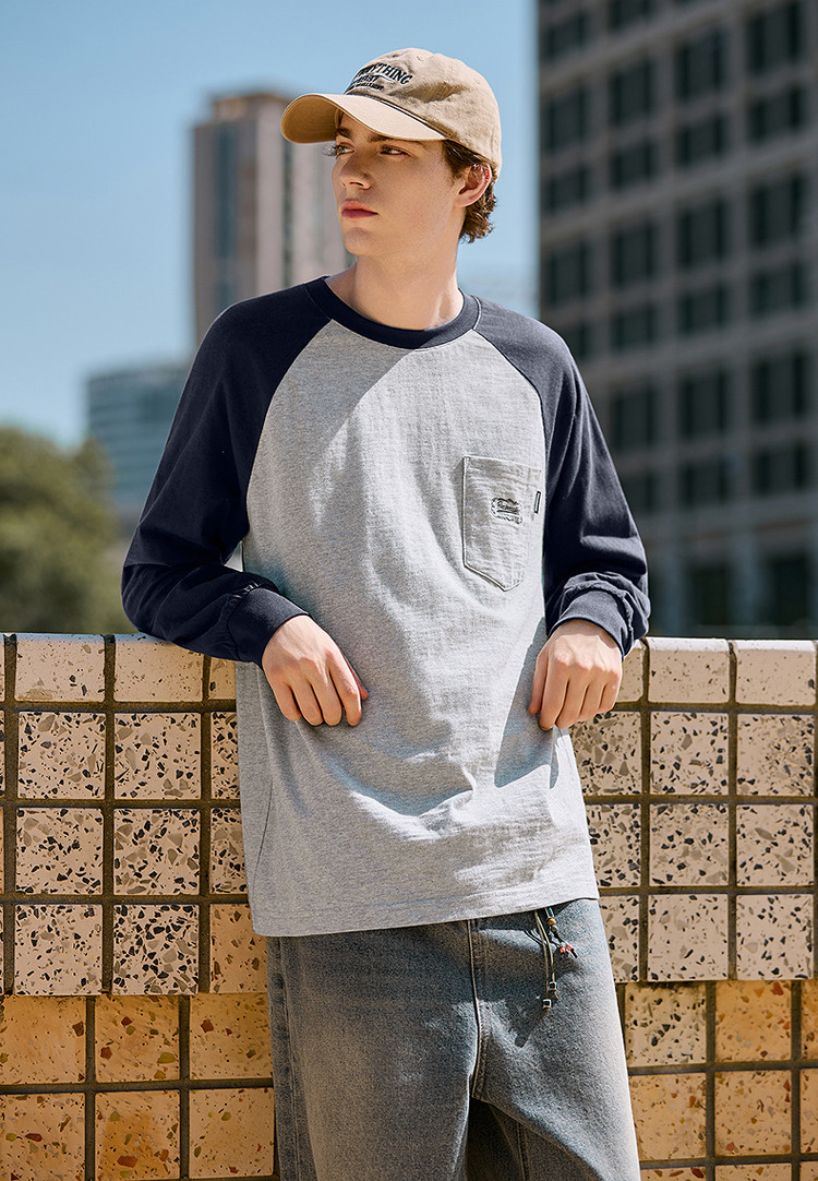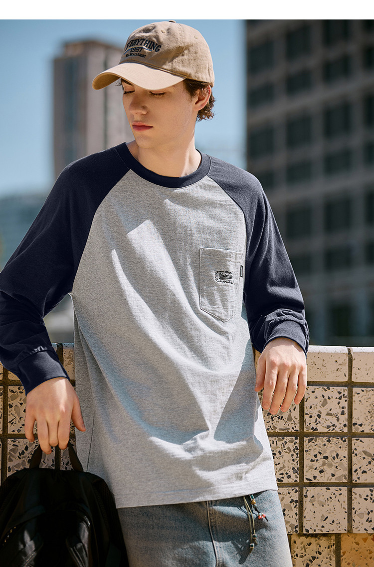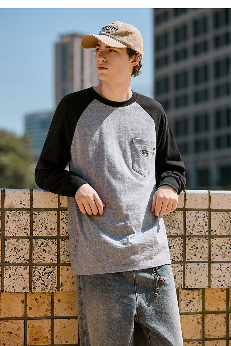 唐狮2025春季新款长袖T恤男撞色拼接上衣宽松插肩袖t设计感打底衫