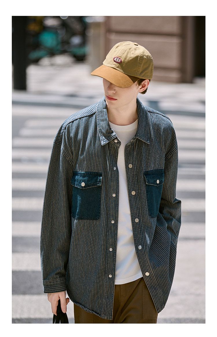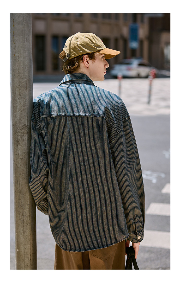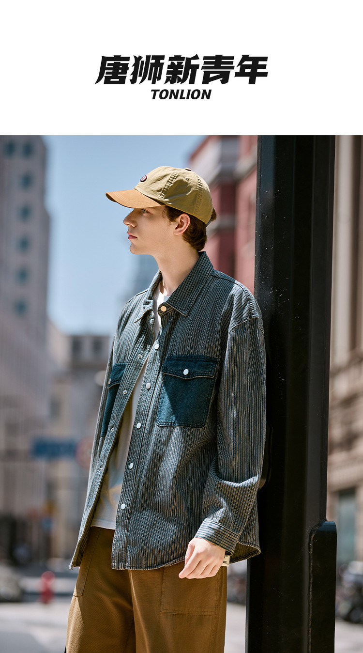 唐狮春秋季新款条纹开衫男宽松工装纯色衬衣休闲外套牛仔潮