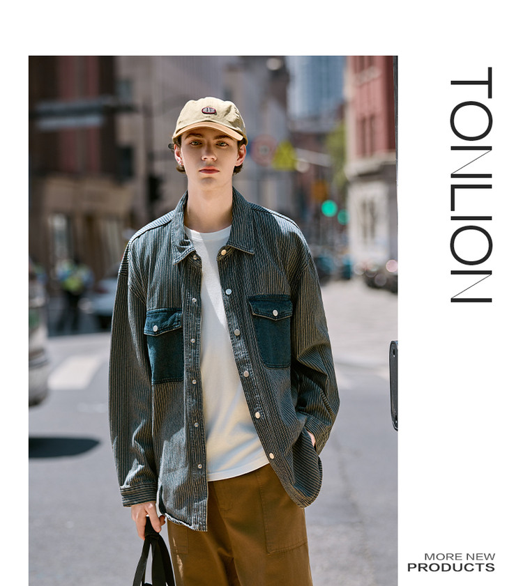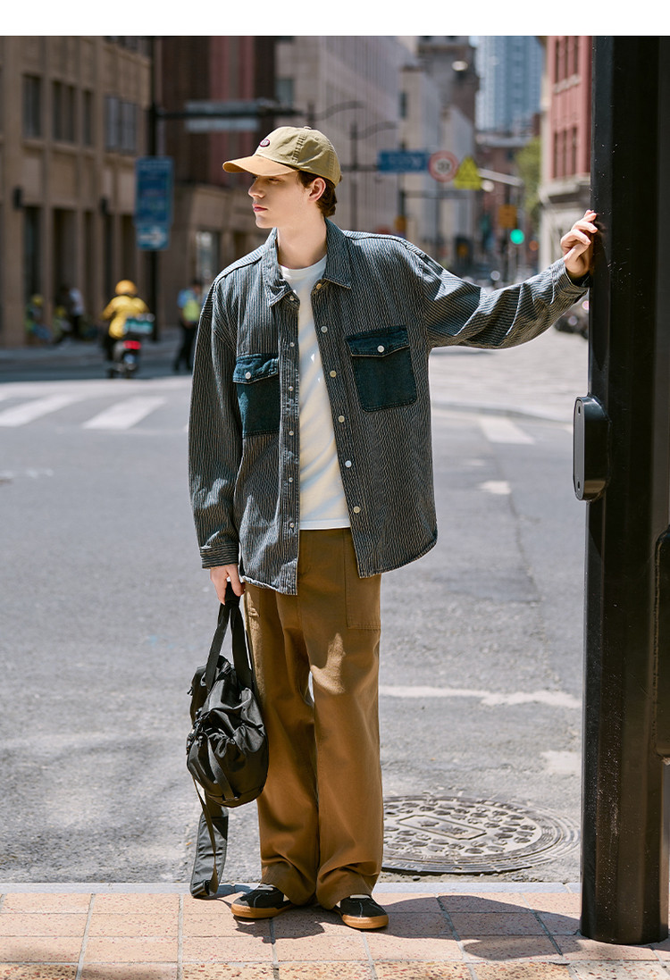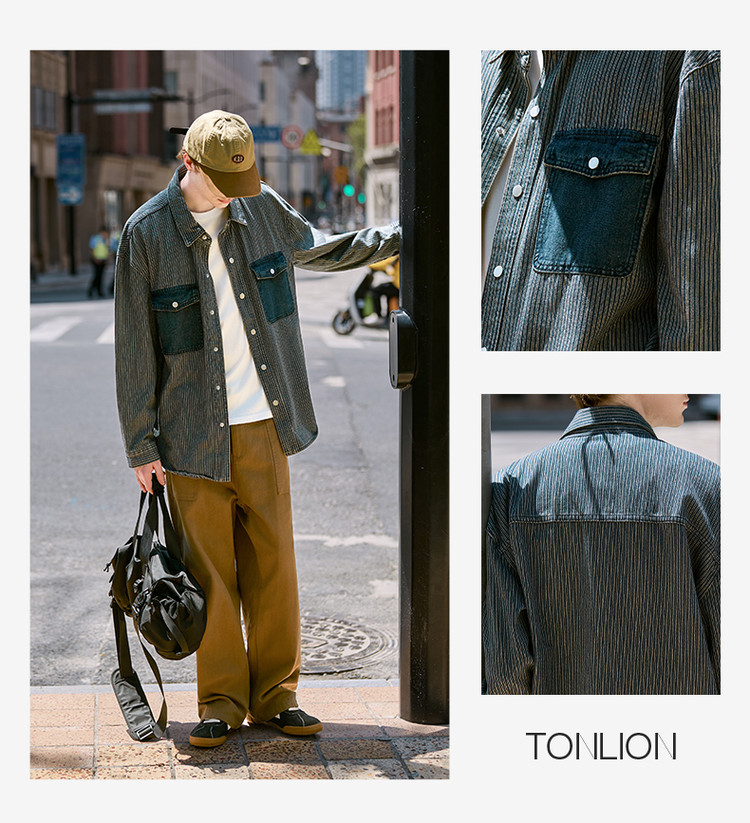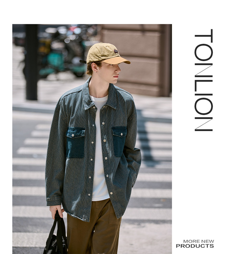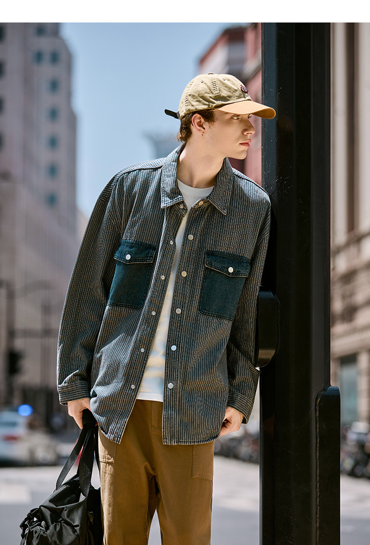 唐狮春秋季新款条纹开衫男宽松工装纯色衬衣休闲外套牛仔潮