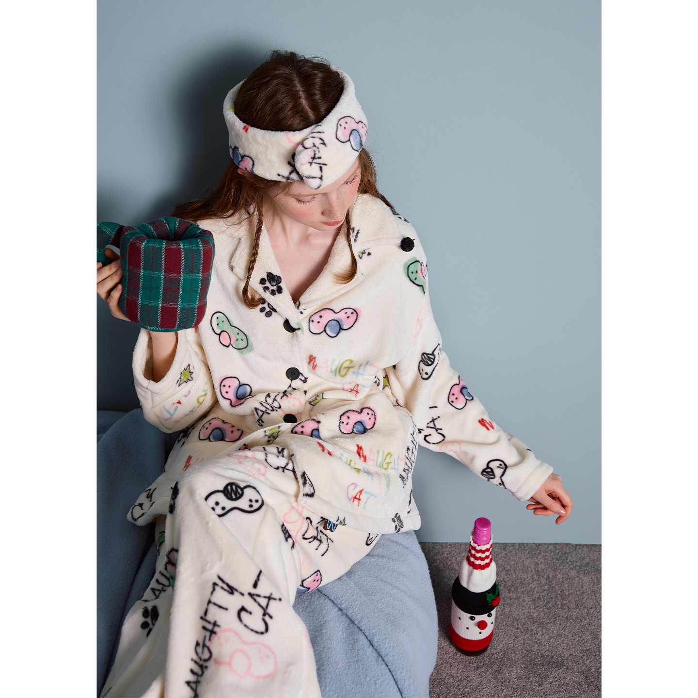 yso【酷猫系列】睡衣女冬季卡通满印牛奶绒加厚保暖家居服套装D
