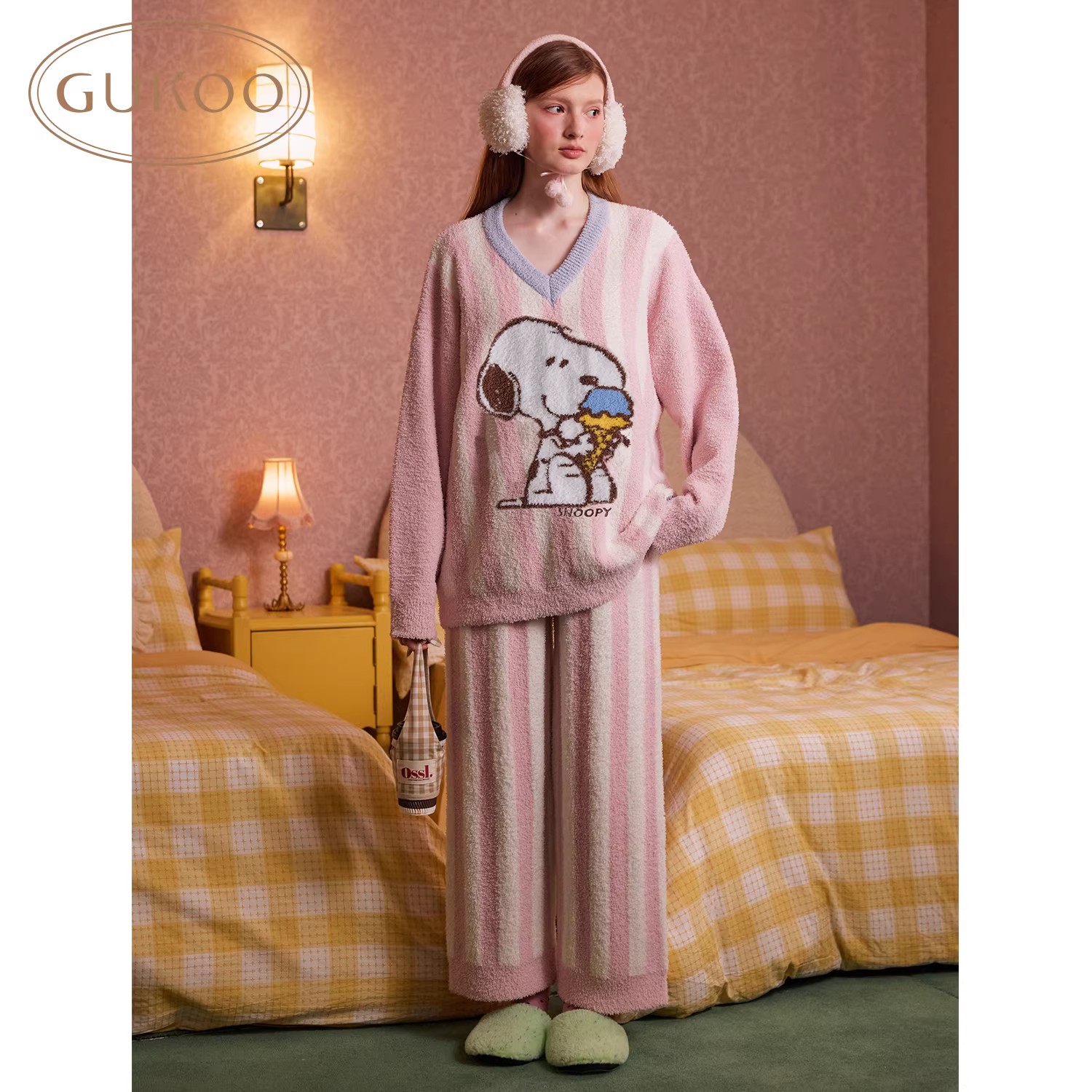 Gukoo/果壳新款半边绒保暖睡衣女秋冬可爱卡通家居服冬套装D