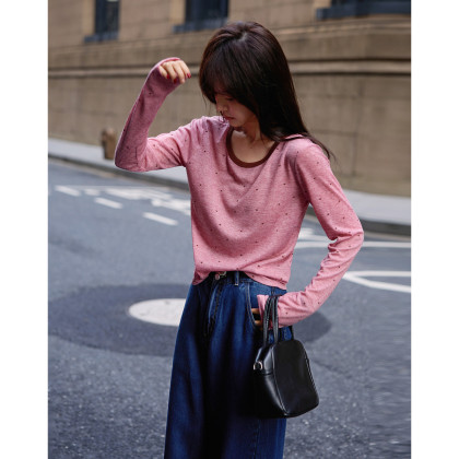 【复古波尔卡】秋季法式撞色圆领波点印花高弹舒适藏肉女式t恤