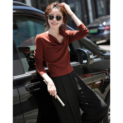 【法韵都市】秋季气质名媛不对称斜领褶皱修身云朵棉舒弹女式t恤