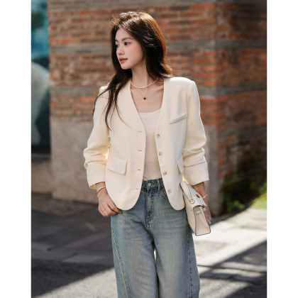 【至简内核】秋季商务通勤小香风V领毛边单排扣短款女式西装外套