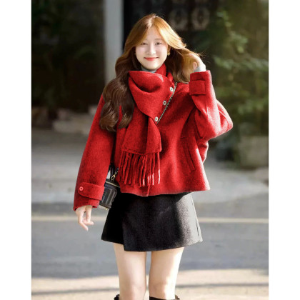 【奢暖绵羊毛】2025冬可脱卸围巾V领双面呢大衣宽松毛呢外套女短款