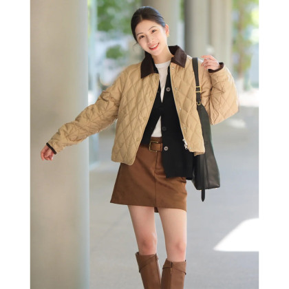 【巴恩风系列】2025冬保暖菱格绗缝棉衣拼接翻领复古小个子女式棉服