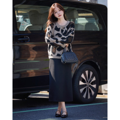 【豹纹飒出圈】2025冬复古风圆领提花线衫宽松含绵羊毛针织衫女上衣