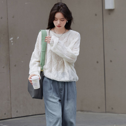 【时尚绞花】秋季简约圆领时尚绞花百搭宽松长袖套头线衫