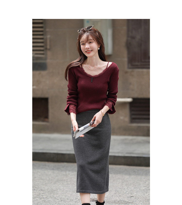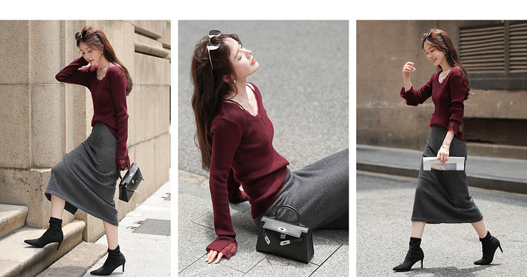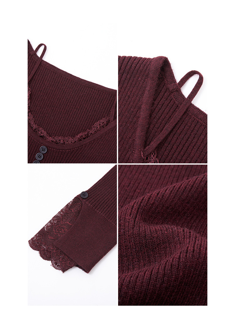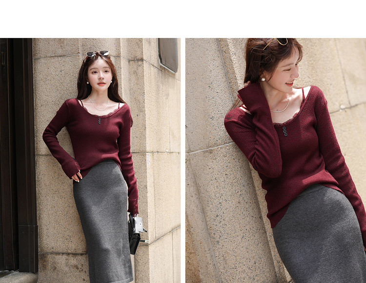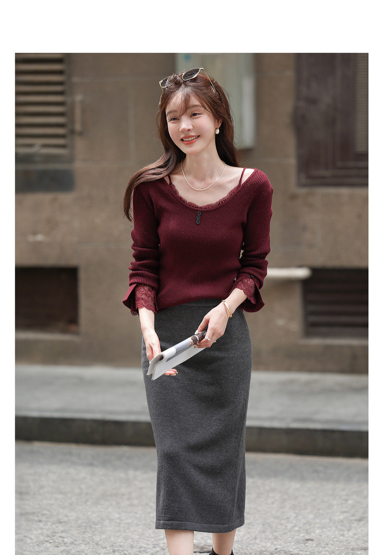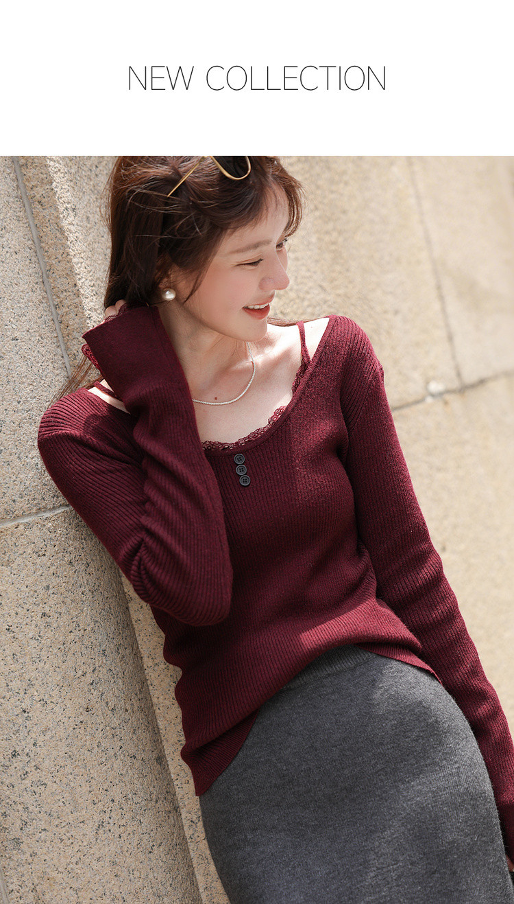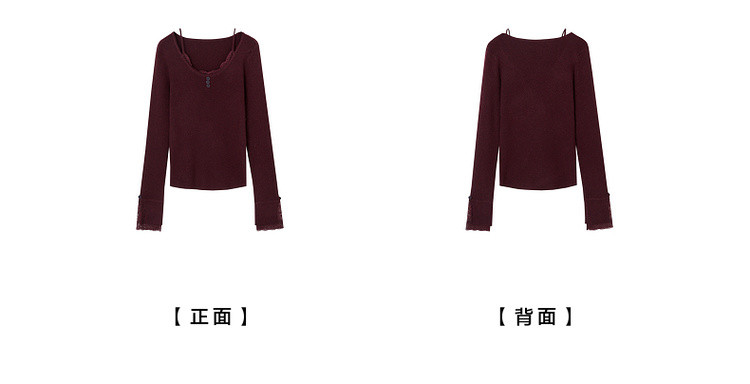 【窈窕日常】秋季蕾丝拼接U领线衫修身短款含绵羊毛针织衫女上衣