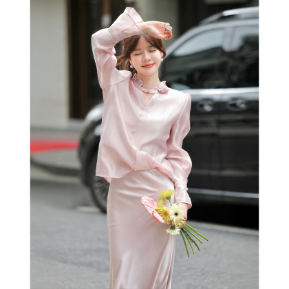 【奢感莱赛尔】秋季静奢通勤花朵装饰立领衬衫泡泡袖衬衣女装上衣